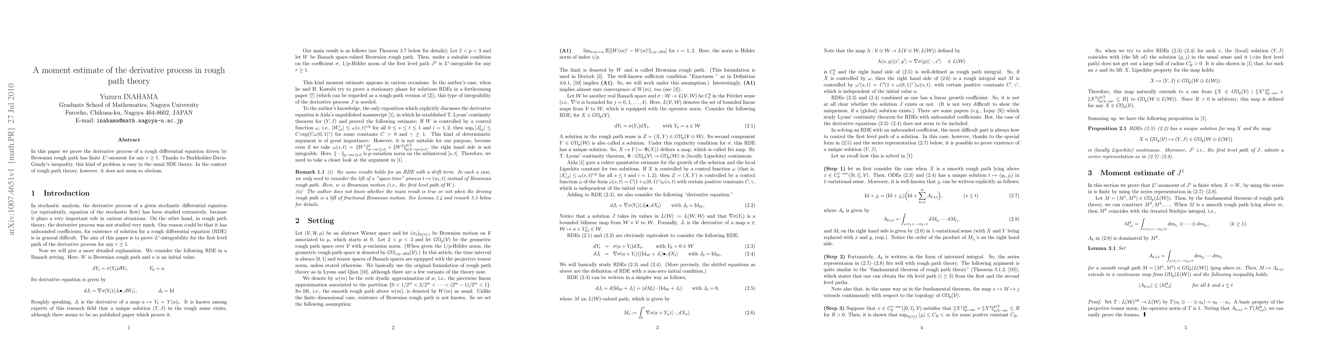 In this paper we prove the derivative process of a rough differential equation driven by Brownian rough path has finite $L^r$-moment for any $r /ge 1$. Thanks to Burkholder-Davis-Gundy's inequality, this kind of problem is easy in the usual SDE theory. In the context of rough path theory, however, it does not seem so obvious.