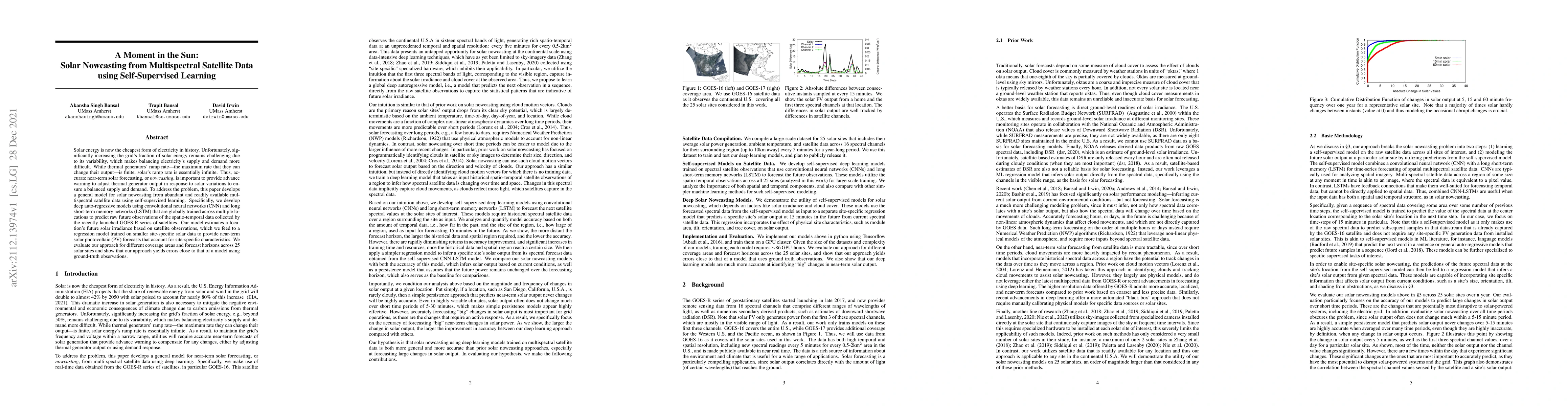 This paper develops a self-supervised learning model for solar nowcasting using multispectral satellite data, employing CNNs and LSTMs to predict future solar irradiance. The approach combines satellite observations with site-specific regression models to provide accurate near-term solar photovoltaic forecasts, demonstrating competitive performance across multiple solar sites.