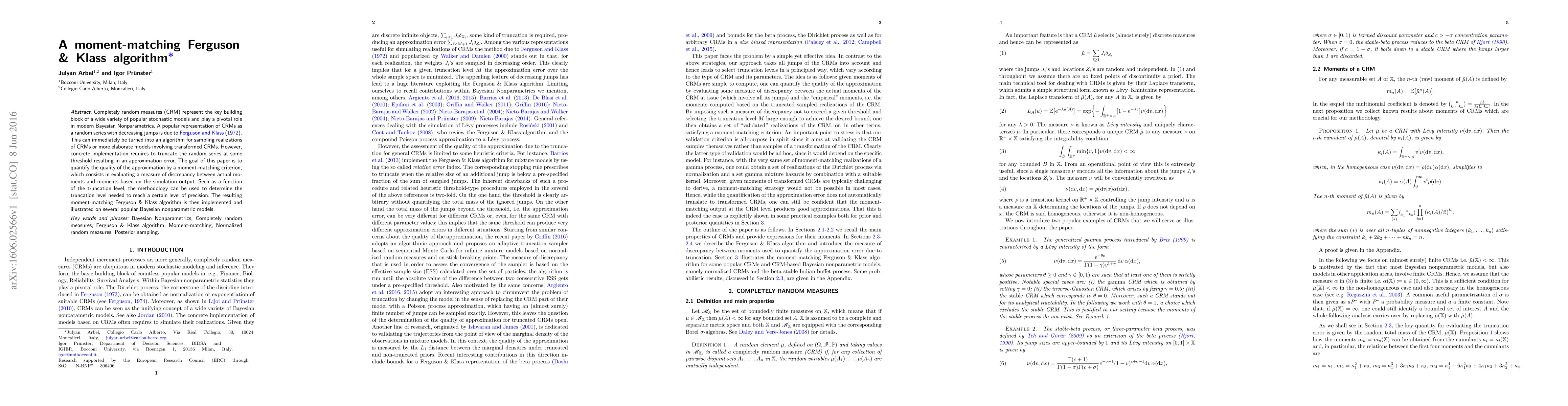 Completely random measures (CRM) represent the key building block of a wide variety of popular stochastic models and play a pivotal role in modern Bayesian Nonparametrics. A popular representation of CRMs as a random series with decreasing jumps is due to Ferguson and Klass (1972). This can immediately be turned into an algorithm for sampling realizations of CRMs or more elaborate models involving transformed CRMs. However, concrete implementation requires to truncate the random series at some threshold resulting in an approximation error. The goal of this paper is to quantify the quality of the approximation by a moment-matching criterion, which consists in evaluating a measure of discrepancy between actual moments and moments based on the simulation output. Seen as a function of the truncation level, the methodology can be used to determine the truncation level needed to reach a certain level of precision. The resulting moment-matching \FK algorithm is then implemented and illustrated on several popular Bayesian nonparametric models.