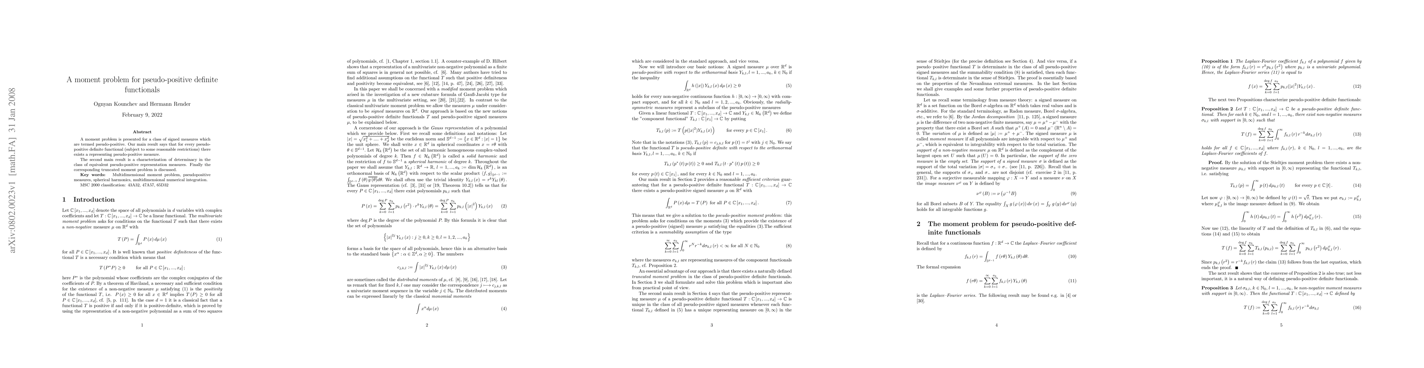 A moment problem is presented for a class of signed measures which are termed pseudo-positive. Our main result says that for every pseudo-positive definite functional (subject to some reasonable restrictions) there exists a representing pseudo-positive measure. The second main result is a characterization of determinacy in the class of equivalent pseudo-positive representation measures. Finally the corresponding truncated moment problem is discussed.