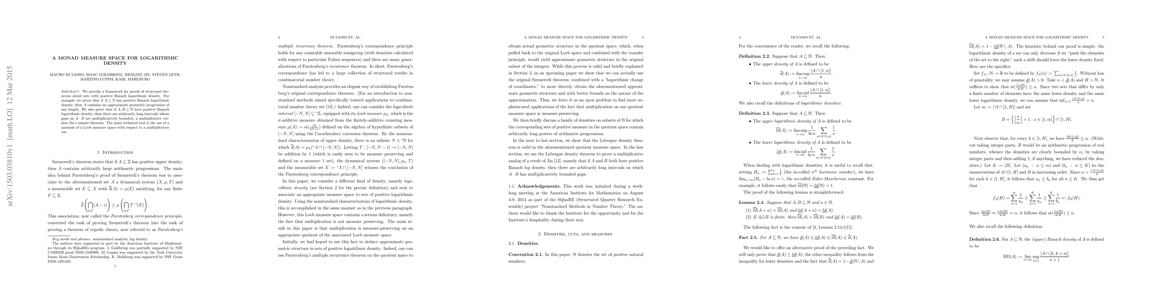 We provide a framework for proofs of structural theorems about sets with positive Banach logarithmic density. For example, we prove that if $A\subseteq \mathbb{N}$ has positive Banach logarithmic density, then $A$ contains an approximate geometric progression of any length. We also prove that if $A,B\subseteq \mathbb{N}$ have positive Banach logarithmic density, then there are arbitrarily long intervals whose gaps on $A\cdot B$ are multiplicatively bounded, a multiplicative version Jin's sumset theorem. The main technical tool is the use of a quotient of a Loeb measure space with respect to a multiplicative cut.