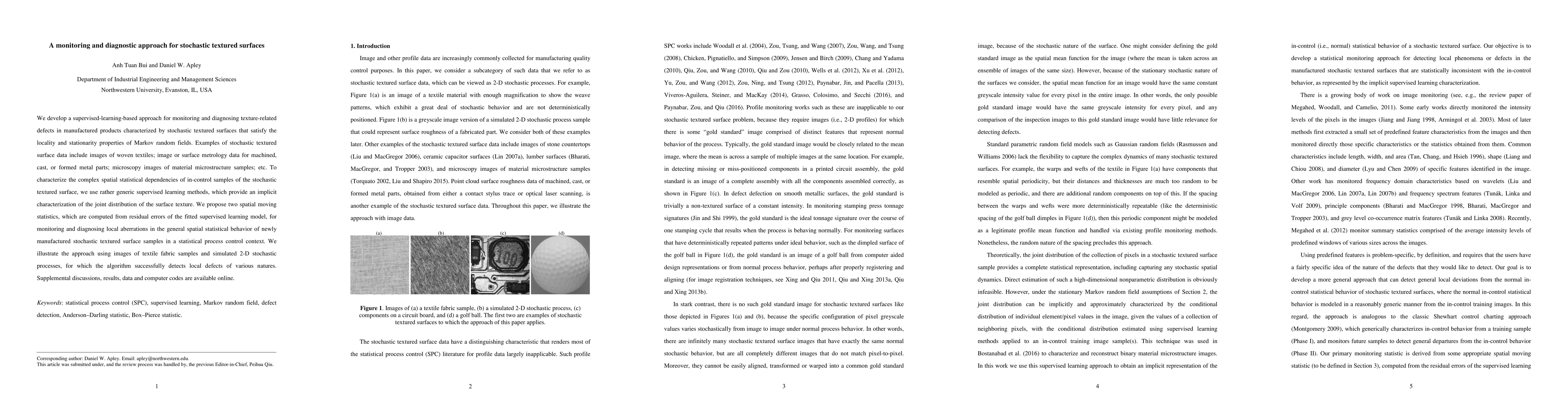The paper presents a supervised-learning-based approach for monitoring and diagnosing texture-related defects in manufactured products with stochastic textured surfaces, utilizing locality and stationarity properties of Markov random fields.