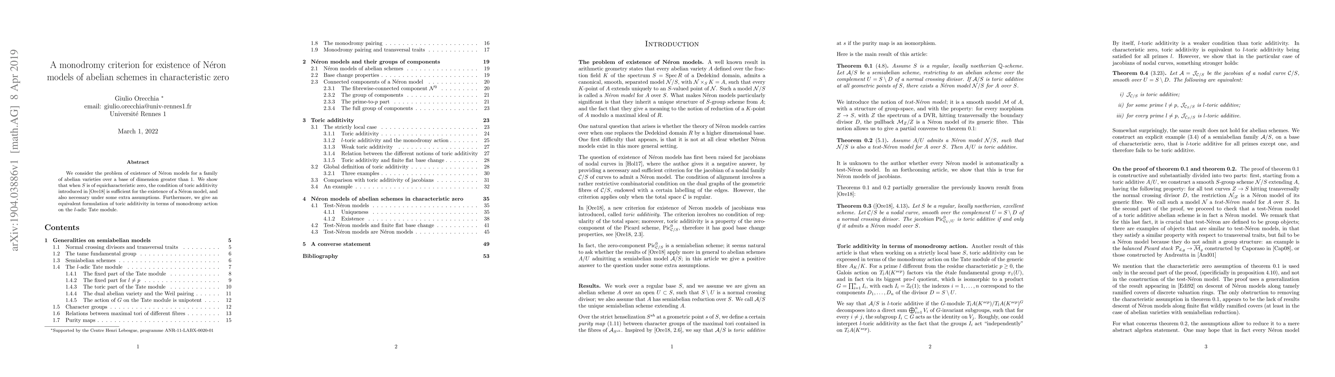 We consider the problem of existence of Neron models for a family of abelian varieties over a base of dimension greater than 1. We show that when S is of equicharacteristic zero, the condition of toric additivity introduced in [Ore18] is sufficient for the existence of a Neron model, and also necessary under some extra assumptions. Furthermore, we give an equivalent formulation of toric additivity in terms of monodromy action on the l-adic Tate module.