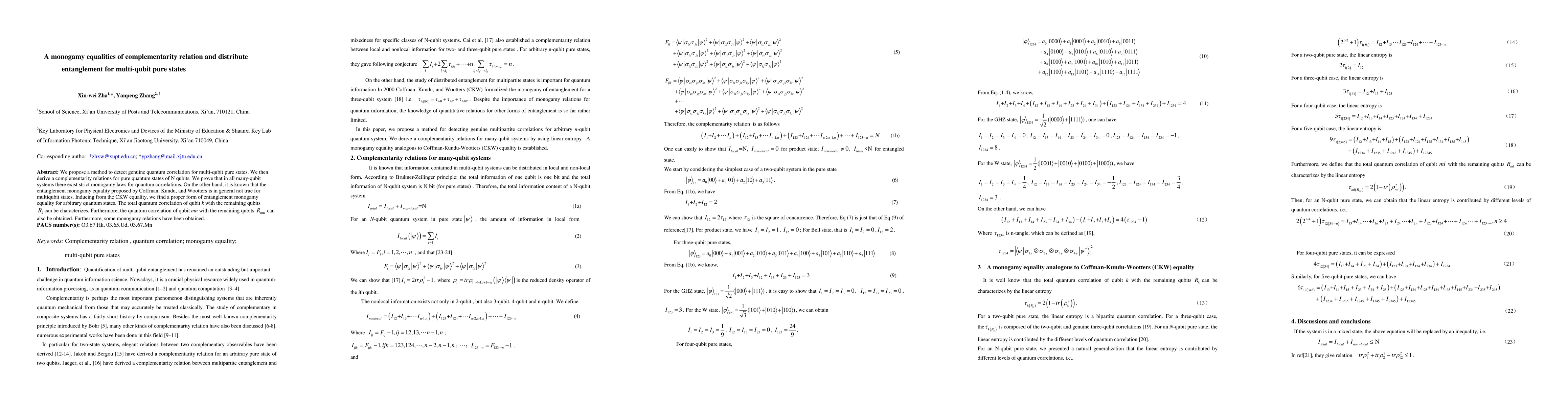 We propose a method to detect genuine quantum correlation for multi-qubit pure states. We then derive a complementarity relations for pure quantum states of N qubits. We prove that in all many-qubit systems there exist strict monogamy laws for quantum correlations. On the other hand, it is known that the entanglement monogamy equality proposed by Coffman, Kundu, and Wootters is in general not true for multiqubit states. Inducing from the CKW equality, we find a proper form of entanglement monogamy equality for arbitrary quantum states. The total quantum correlation of qubit k with the remaining qubits Rk can be characterizes. Furthermore, the quantum correlation of qubit mn with the remaining qubits Rmn can also be obtained. Furthermore, some monogamy relations have been obtained.