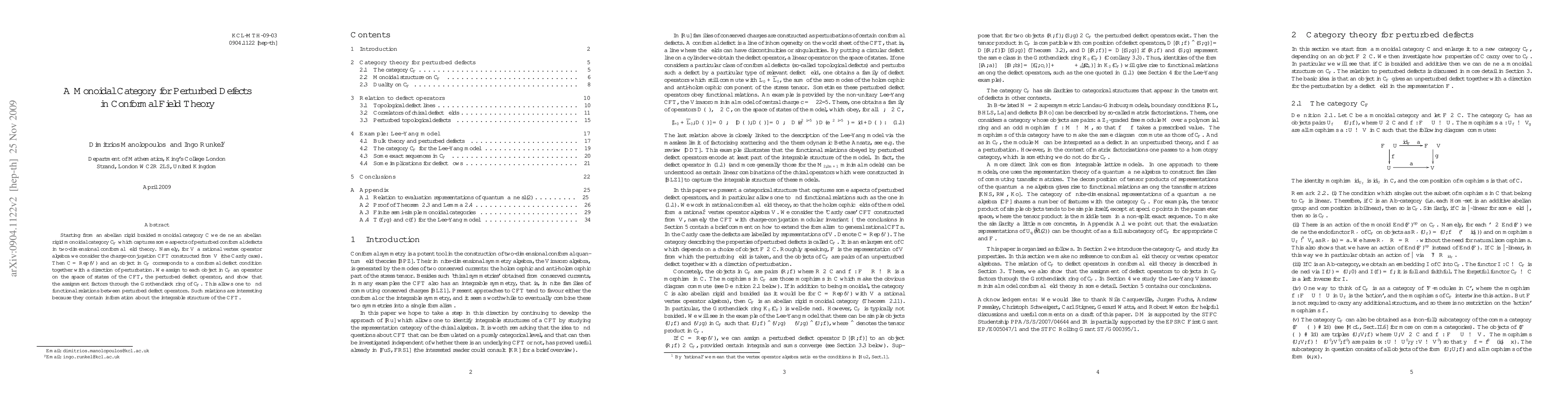 This paper constructs an abelian rigid monoidal category C_F from an abelian rigid braided monoidal category C to model perturbed conformal defects in two-dimensional conformal field theory, and establishes functional relations between perturbed defect operators that reveal the CFT's integrable structure.
