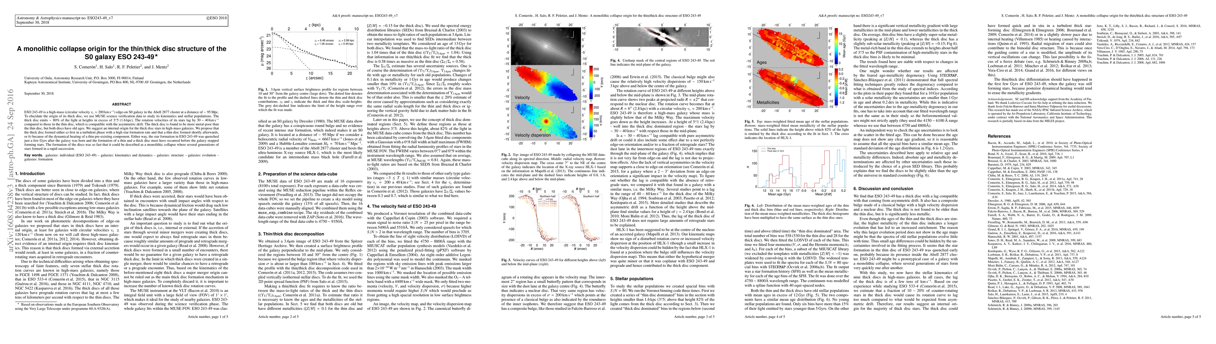 This paper investigates the origin of the thick and thin disc structure in the high-mass galaxy ESO 243-49 using MUSE data. It proposes a monolithic collapse origin for the discs, suggesting that the thick disc formed through either early turbulent star formation or dynamical heating of an existing thin disc, with both discs forming rapidly before star formation ceased.