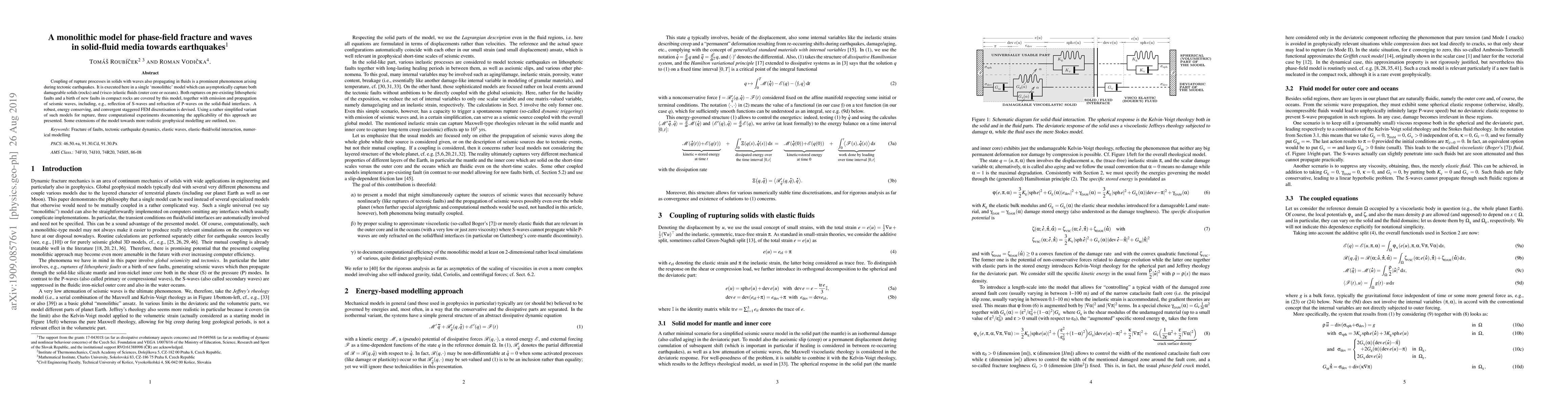 Coupling of rupture processes in solids with waves also propagating in fluids is a prominent phenomenon arising during tectonic earthquakes. It is executed here in a single `monolithic' model which can asymptotically capture both damageable solids (rocks) and (visco-)elastic fluids (outer core or oceans). Both ruptures on pre-existing lithospheric faults and a birth of new faults in compact rocks are covered by this model, together with emission and propagation of seismic waves, including, e.g., reflection of S-waves and refraction of P-waves on the solid-fluid interfaces. A robust, energy conserving, and convergent staggered FEM discretisation is devised. Using a rather simplified variant of such models for rupture, three computational experiments documenting the applicability of this approach are presented. Some extensions of the model towards more realistic geophysical modelling are outlined, too.