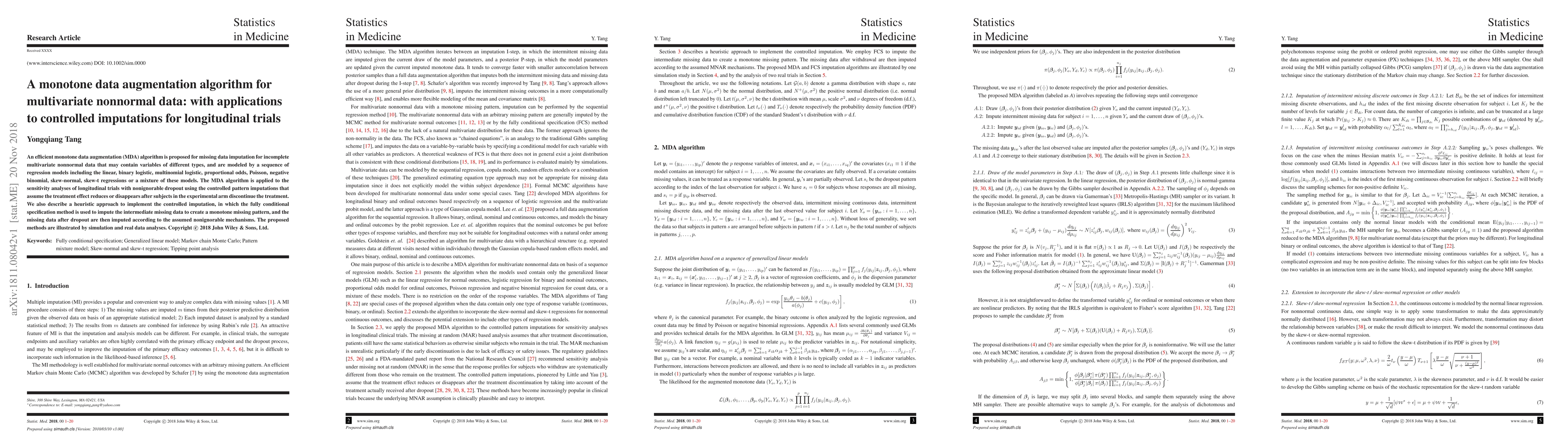 An efficient monotone data augmentation (MDA) algorithm is proposed for missing data imputation for incomplete multivariate nonnormal data that may contain variables of different types, and are modeled by a sequence of regression models including the linear, binary logistic, multinomial logistic, proportional odds, Poisson, negative binomial, skew-normal, skew-t regressions or a mixture of these models. The MDA algorithm is applied to the sensitivity analyses of longitudinal trials with nonignorable dropout using the controlled pattern imputations that assume the treatment effect reduces or disappears after subjects in the experimental arm discontinue the treatment. We also describe a heuristic approach to implement the controlled imputation, in which the fully conditional specification method is used to impute the intermediate missing data to create a monotone missing pattern, and the missing data after dropout are then imputed according to the assumed nonignorable mechanisms. The proposed methods are illustrated by simulation and real data analyses.