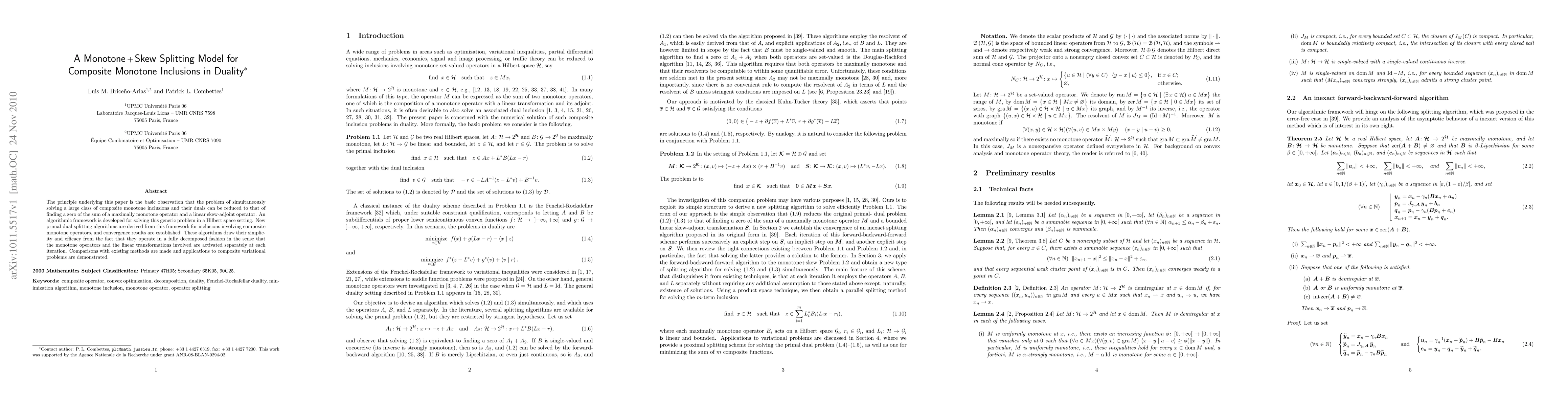 This paper develops a new monotone+skew splitting model for solving composite monotone inclusions and their duals by decomposing the problem into finding a zero of a sum of a maximally monotone operator and a linear skew-adjoint operator. It introduces efficient primal-dual algorithms and proves their convergence, demonstrating their advantages over existing methods through applications to composite variational problems.