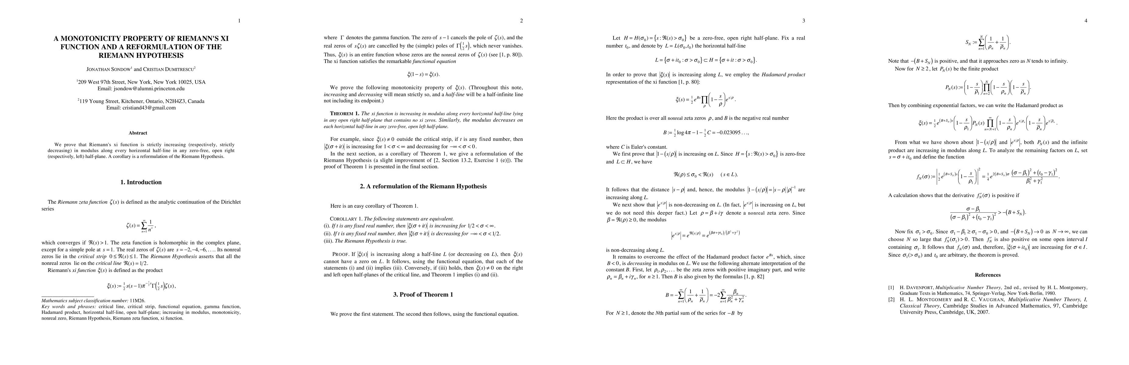 Summary: This paper demonstrates that Riemann's xi function exhibits monotonicity in modulus along horizontal half-lines in zero-free regions, leading to a new reformulation of the Riemann Hypothesis.