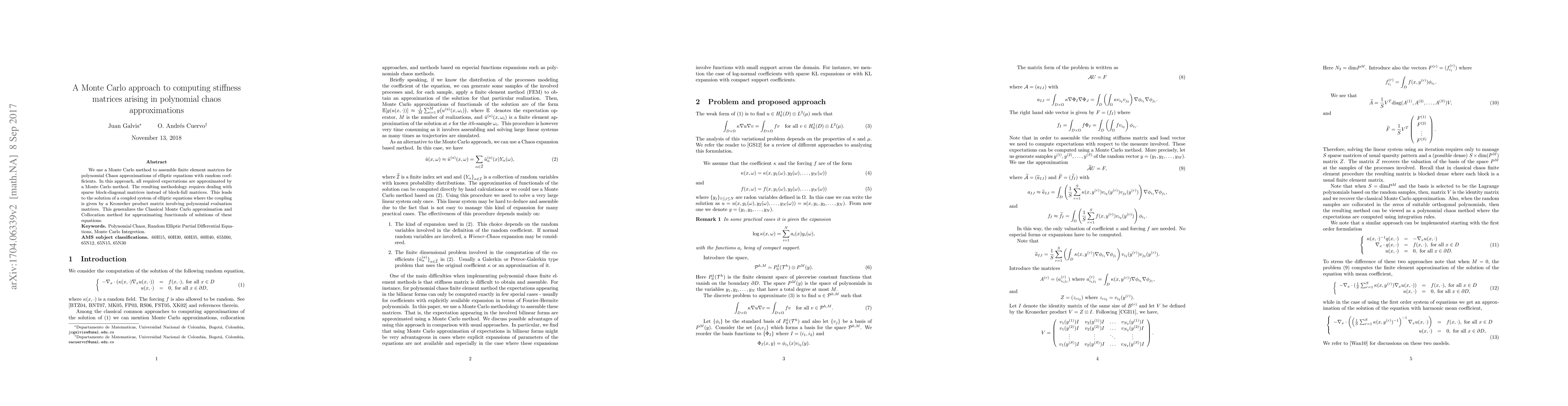 We use a Monte Carlo method to assemble finite element matrices for polynomial Chaos approximations of elliptic equations with random coefficients. In this approach, all required expectations are approximated by a Monte Carlo method. The resulting methodology requires dealing with sparse block-diagonal matrices instead of block-full matrices. This leads to the solution of a coupled system of elliptic equations where the coupling is given by a Kronecker product matrix involving polynomial evaluation matrices. This generalizes the Classical Monte Carlo approximation and Collocation method for approximating functionals of solutions of these equations.