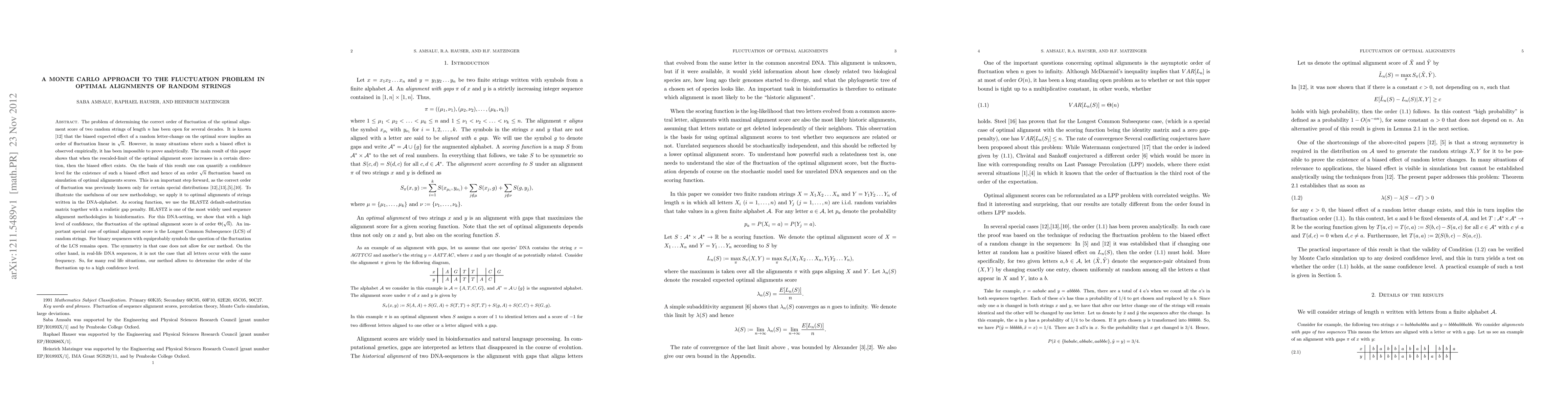 This paper introduces a Monte Carlo approach to determine the order of fluctuation in the optimal alignment score of random strings, showing that it is linear in $\sqrt{n}$. It applies this methodology to DNA sequences, confirming a high-confidence $\Theta(\sqrt{n})$ fluctuation order, thus extending previous results to more general cases beyond special distributions.