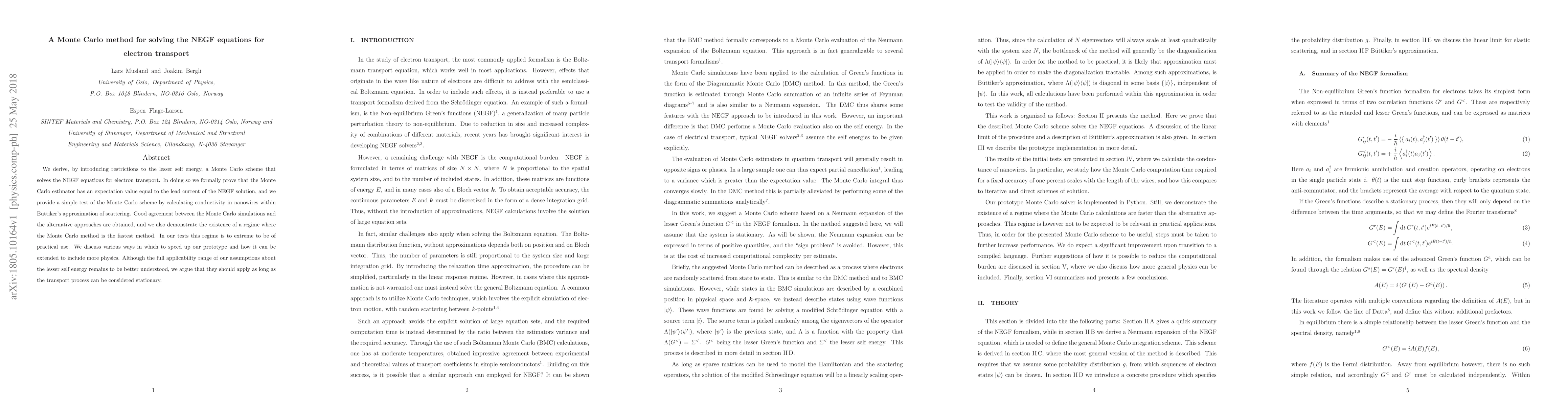 This paper introduces a Monte Carlo method to solve the NEGF equations for electron transport, proving its expectation value matches the lead current. Tests on nanowire conductivity show good agreement with alternative methods, though the fastest regime identified is impractical. The authors discuss potential improvements and extensions.