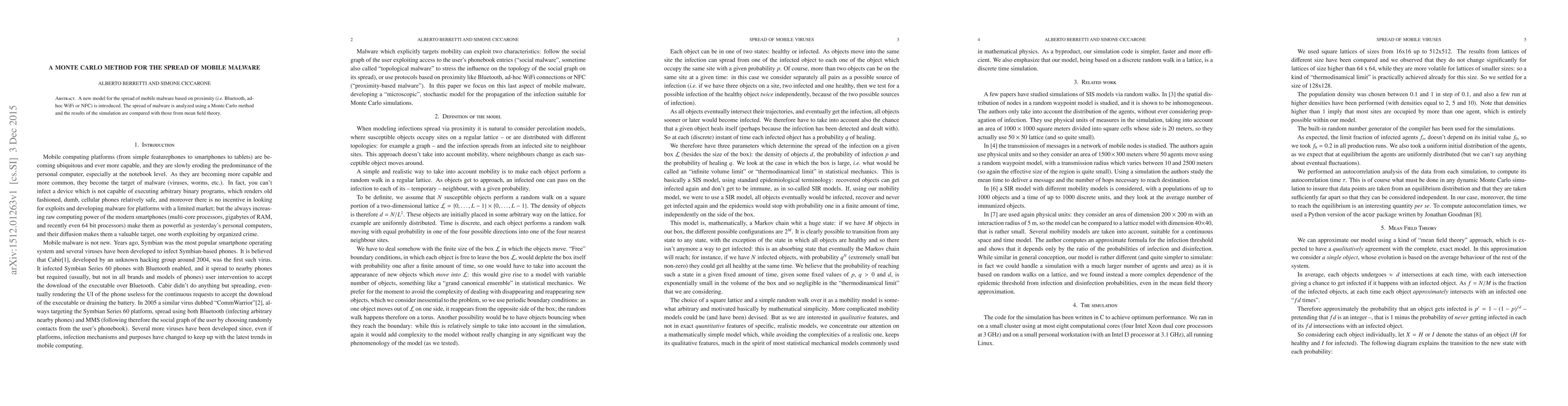 A new model for the spread of mobile malware based on proximity (i.e. Bluetooth, ad-hoc WiFi or NFC) is introduced. The spread of malware is analyzed using a Monte Carlo method and the results of the simulation are compared with those from mean field theory.