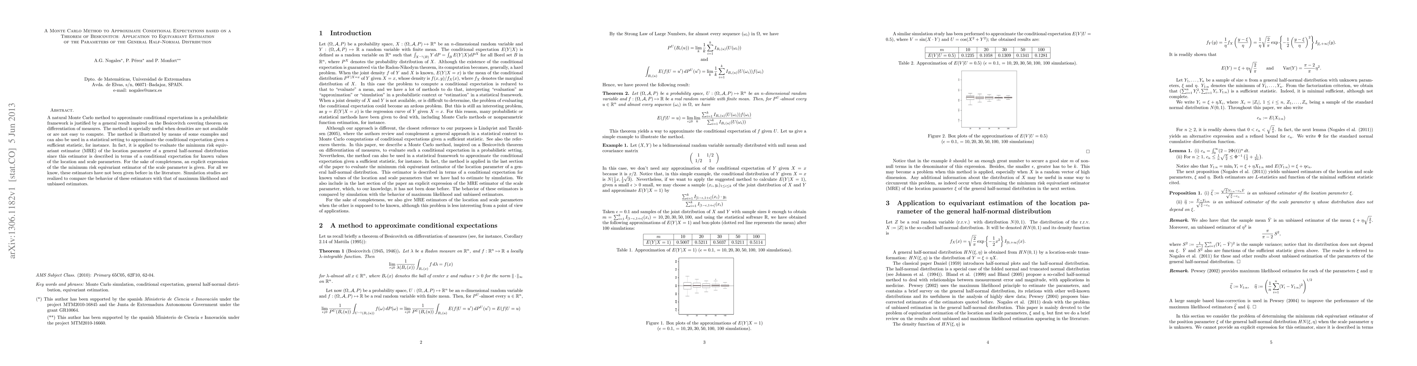 A natural Monte Carlo method to approximate conditional expectations in a probabilistic framework is justified by a general result inspired on the Besicovitch covering theorem on differentiation of measures. The method is specially useful when densities are not available or are not easy to compute. The method is illustrated by means of some examples and can also be used in a statistical setting to approximate the conditional expectation given a sufficient statistic, for instance. In fact, it is applied to evaluate the minimum risk equivariant estimator (MRE) of the location parameter of a general half-normal distribution since this estimator is described in terms of a conditional expectation for known values of the location and scale parameters. For the sake of completeness, an explicit expression of the the minimum risk equivariant estimator of the scale parameter is given. For all we know, these estimators have not been given before in the literature. Simulation studies are realized to compare the behavior of these estimators with that of maximum likelihood and unbiased estimators.