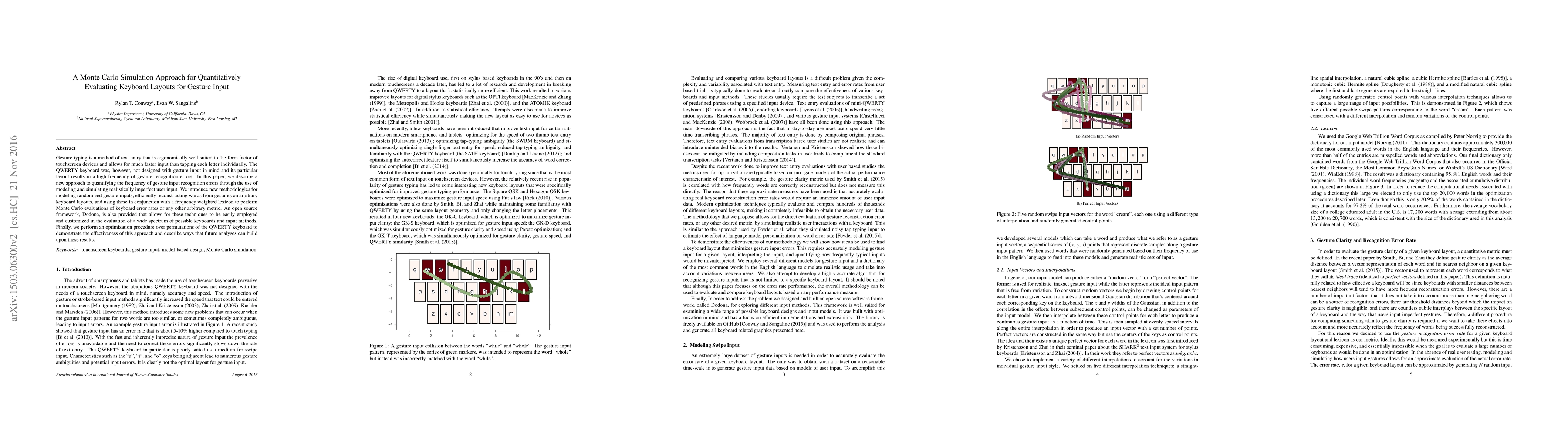 Gesture typing is a method of text entry that is ergonomically well-suited to the form factor of touchscreen devices and allows for much faster input than tapping each letter individually. The QWERTY keyboard was, however, not designed with gesture input in mind and its particular layout results in a high frequency of gesture recognition errors. In this paper, we describe a new approach to quantifying the frequency of gesture input recognition errors through the use of modeling and simulating realistically imperfect user input. We introduce new methodologies for modeling randomized gesture inputs, efficiently reconstructing words from gestures on arbitrary keyboard layouts, and using these in conjunction with a frequency weighted lexicon to perform Monte Carlo evaluations of keyboard error rates or any other arbitrary metric. An open source framework, Dodona, is also provided that allows for these techniques to be easily employed and customized in the evaluation of a wide spectrum of possible keyboards and input methods. Finally, we perform an optimization procedure over permutations of the QWERTY keyboard to demonstrate the effectiveness of this approach and describe ways that future analyses can build upon these results.