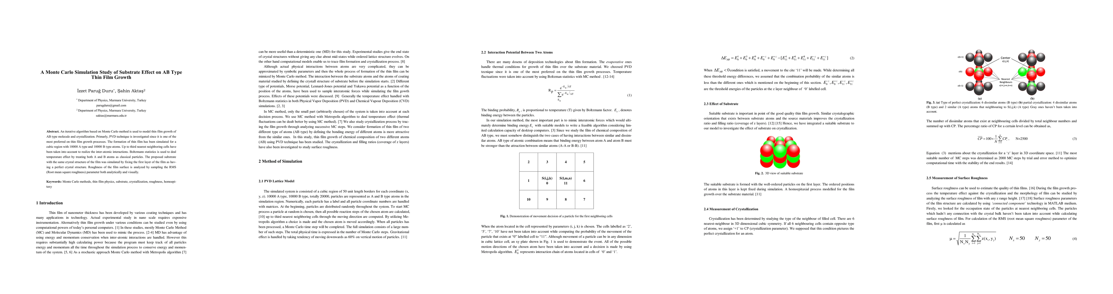 This study uses a Monte Carlo simulation to model the growth of AB type thin films using PVD techniques, focusing on inter-atomic interactions up to third nearest neighbors. The substrate's crystal structure is simulated to analyze the film's surface roughness via RMS parameter.