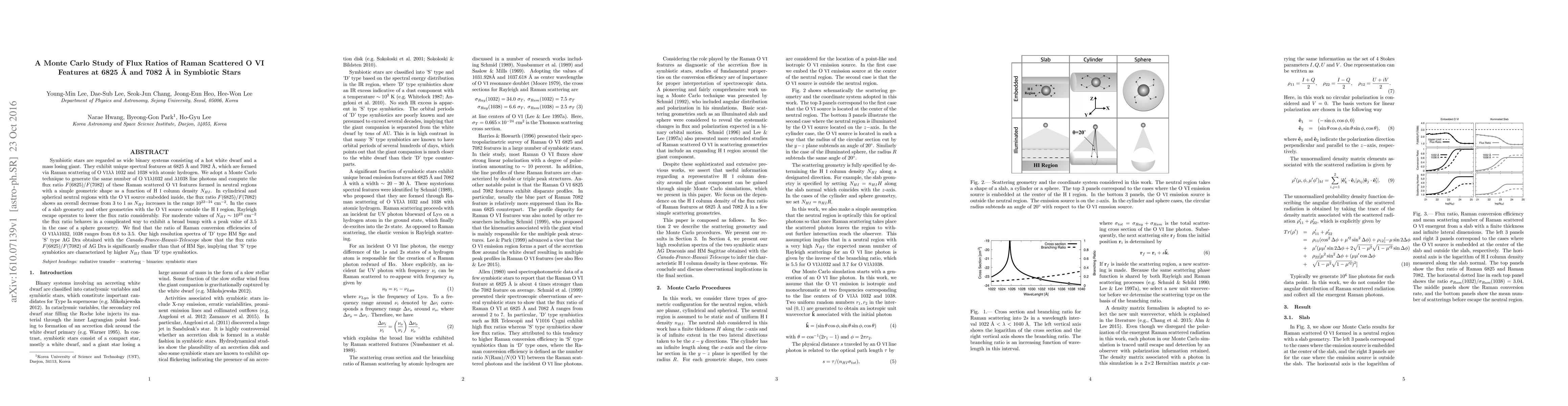 Symbiotic stars are regarded as wide binary systems consisting of a hot white dwarf and a mass losing giant. They exhibit unique spectral features at 6825 \AA\ and 7082 \AA, which are formed via Raman scattering of \ion{O}{6}$\lambda\lambda$ 1032 and 1038 with atomic hydrogen. We adopt a Monte Carlo technique to generate the same number of \ion{O}{6}$\lambda$1032 and $\lambda$1038 line photons and compute the flux ratio $F(6825)/F(7082)$ of these Raman scattered \ion{O}{6} features formed in neutral regions with a simple geometric shape as a function of \ion{H}{1} column density $N_{HI}$. In cylindrical and spherical neutral regions with the \ion{O}{6} source embedded inside, the flux ratio $F(6825)/F(7082)$ shows an overall decrease from 3 to 1 as $N_{HI}$ increases in the range $10^{22-24}{\rm\ cm^{-2}}$. In the cases of a slab geometry and other geometries with the \ion{O}{6} source outside the \ion{H}{1} region, Rayleigh escape operates to lower the flux ratio considerably. For moderate values of $N_{HI}\sim 10^{23}{\rm\ cm^{-2}}$ the flux ratio behaves in a complicated way to exhibit a broad bump with a peak value of 3.5 in the case of a sphere geometry. We find that the ratio of Raman conversion efficiencies of \ion{O}{6}$\lambda\lambda$1032, 1038 ranges from 0.8 to 3.5. Our high resolution spectra of 'D' type HM~Sge and 'S' type AG~Dra obtained with the {\it Canada-France-Hawaii-Telescope} show that the flux ratio $F(6825)/F(7082)$ of AG~Dra is significantly smaller than that of HM~Sge, implying that 'S' type symbiotics are characterized by higher $N_{HI}$ than 'D' type symbiotics.