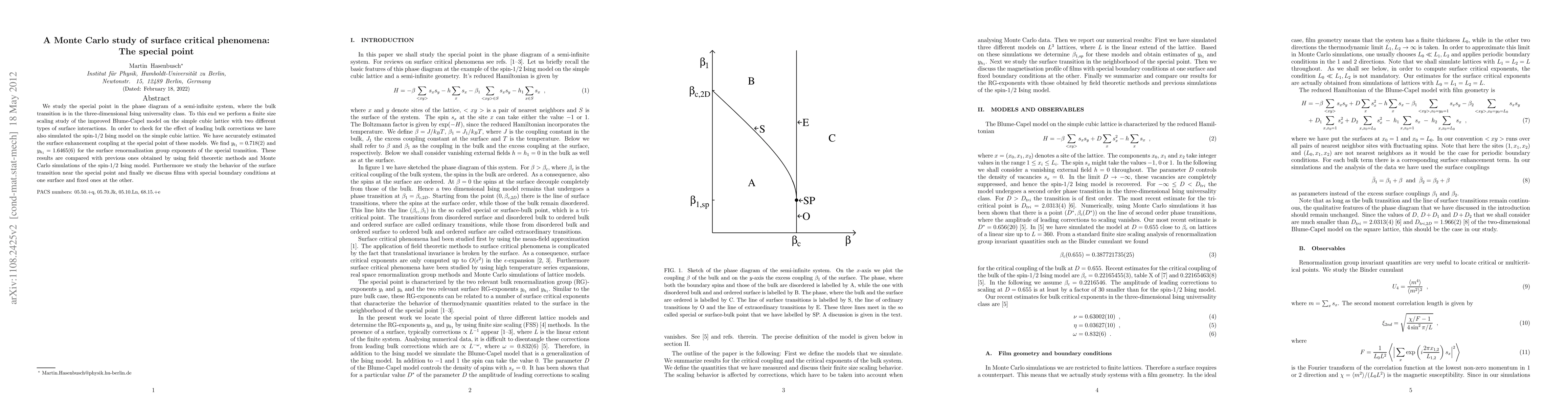 We study the special point in the phase diagram of a semi-infinite system, where the bulk transition is in the three-dimensional Ising universality class. To this end we perform a finite size scaling study of the improved Blume-Capel model on the simple cubic lattice with two different types of surface interactions. In order to check for the effect of leading bulk corrections we have also simulated the spin-1/2 Ising model on the simple cubic lattice. We have accurately estimated the surface enhancement coupling at the special point of these models. We find $y_{t_s}=0.718(2)$ and $y_{h_s}=1.6465(6)$ for the surface renormalization group exponents of the special transitions. These results are compared with previous ones obtained by using field theoretic methods and Monte Carlo simulations of the spin-1/2 Ising model. Furthermore we study the behaviour of the surface transition near the special point and finally we discuss films with special boundary conditions at one surface and fixed ones at the other.