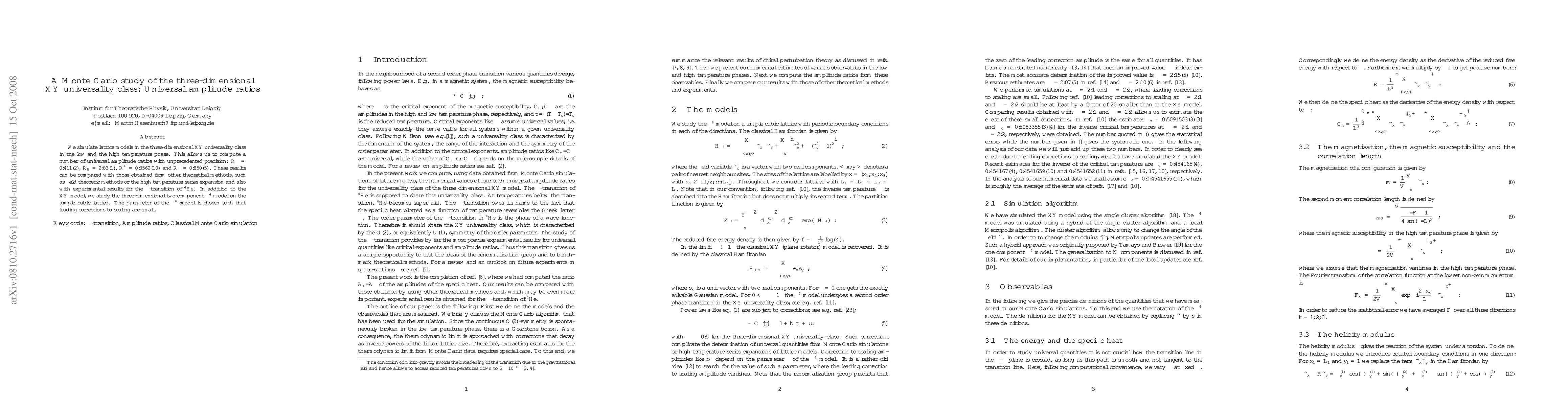 This Monte Carlo study investigates the three-dimensional XY universality class, computing precise universal amplitude ratios in both low and high temperature phases. The results include R_Υ=0.411(2), R_B=2.83(1), R_ξ^+=0.3562(10), and R_ξ^-=0.850(5), which can be compared with theoretical and experimental data for the lambda-transition in $^4$He.