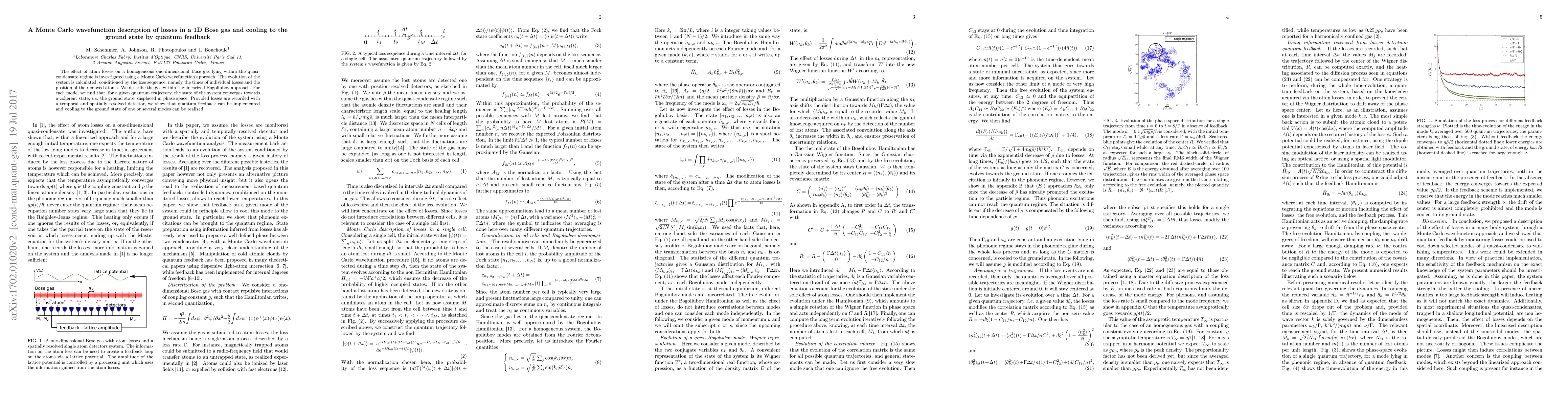 The effect of atom losses on a homogeneous one-dimensional Bose gas lying within the quasi-condensate regime is investigated using a Monte Carlo wavefunction approach. The evolution of the system is calculated, conditioned by the loss sequence, namely the times of individual losses and the position of the removed atoms. We describe the gas within the linearized Bogoliubov approach. For each mode, we find that, for a given quantum trajectory, the state of the system converges towards a coherent state, i.e. the ground state, displaced in phase space. Provided losses are recorded with a temporal and spatially resolved detector, we show that quantum feedback can be implemented and cooling to the ground state of one or several modes can be realized.