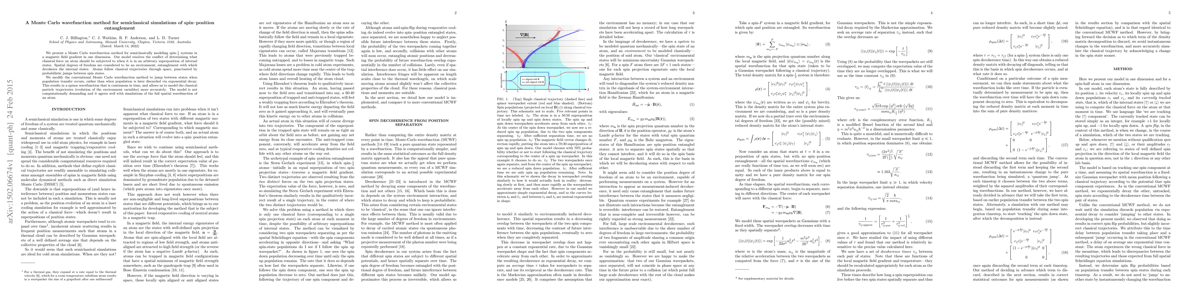We present a Monte Carlo wavefunction method for semiclassically modeling spin-$\frac12$ systems in a magnetic field gradient in one dimension. Our model resolves the conflict of determining what classical force an atom should be subjected to when it is in an arbitrary superposition of internal states. Spatial degrees of freedom are considered to be an environment, entanglement with which decoheres the internal states. Atoms follow classical trajectories through space, punctuated by probabilistic jumps between spin states. We modify the conventional Monte Carlo wavefunction method to jump between states when population transfer occurs, rather than when population is later discarded via exponential decay. This results in a spinor wavefunction that is continuous in time, and allows us to model the classical particle trajectories (evolution of the environment variables) more accurately. The model is not computationally demanding and it agrees well with simulations of the full spatial wavefunction of an atom.