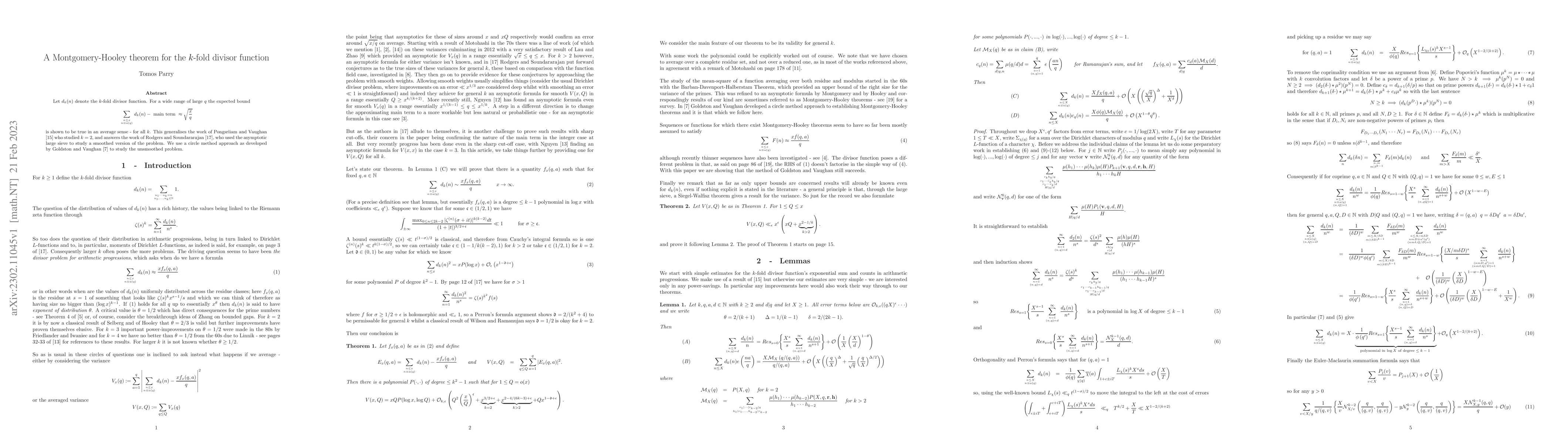 This paper generalizes the Montgomery-Hooley theorem to the $k$-fold divisor function $d_k(n)$, showing that for large $q$, the expected bound $\sum_{n\leq x\atop {n\equiv a(q)}}d_k(n)$ approximates $\sqrt {x/q}$ on average for all $k$. This extends previous work on $k=2$ and employs a circle method approach.