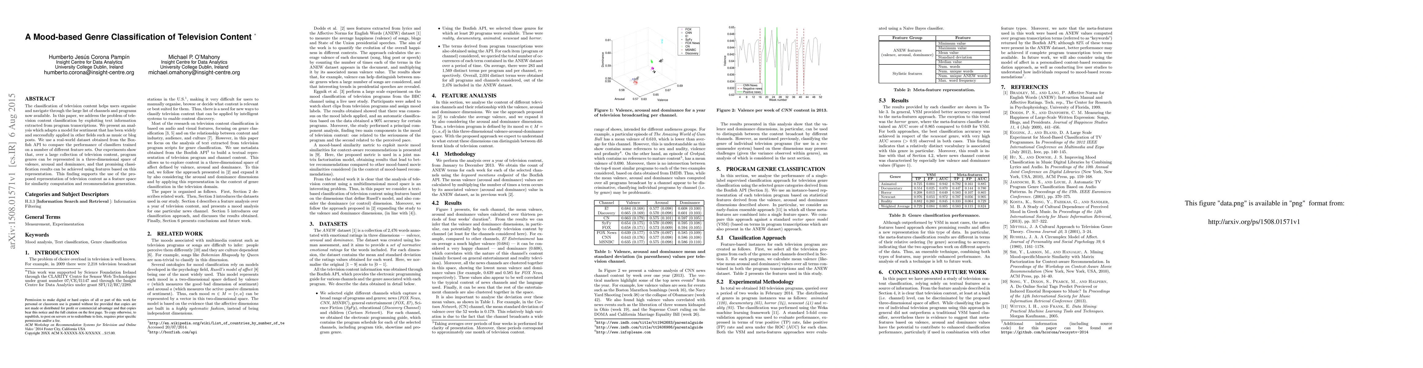 This paper proposes a mood-based genre classification for television content using a three-dimensional space of valence, arousal, and dominance. It demonstrates that classifiers trained on features derived from program transcriptions can achieve promising classification results.