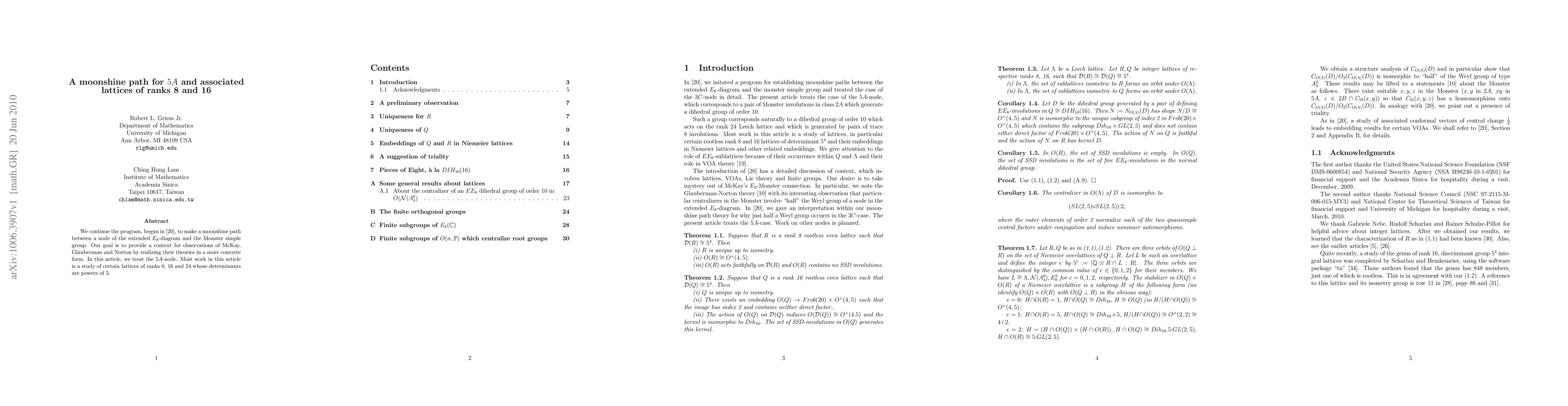 This paper continues research on a moonshine path linking the extended E8-diagram to the Monster group, focusing on the 5A-node. It explores lattices of ranks 8 and 16 with determinants as powers of 5, aiming to provide a concrete context for observations by McKay, Glauberman, and Norton.