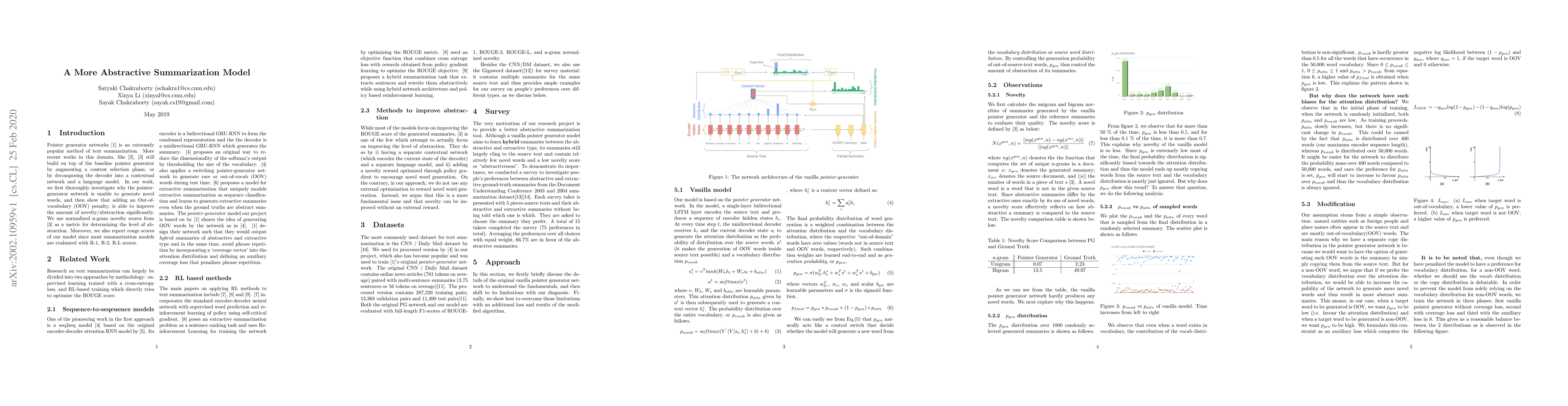 This research introduces an improvement to the pointer-generator network for text summarization, addressing its inability to generate novel words. By adding an Out-of-vocabulary (OOV) penalty, the model significantly increases novelty and abstraction in summaries, as measured by normalized n-gram novelty scores. The model also reports ROUGE scores for evaluation, demonstrating enhanced performance over traditional pointer-generator network-based models.