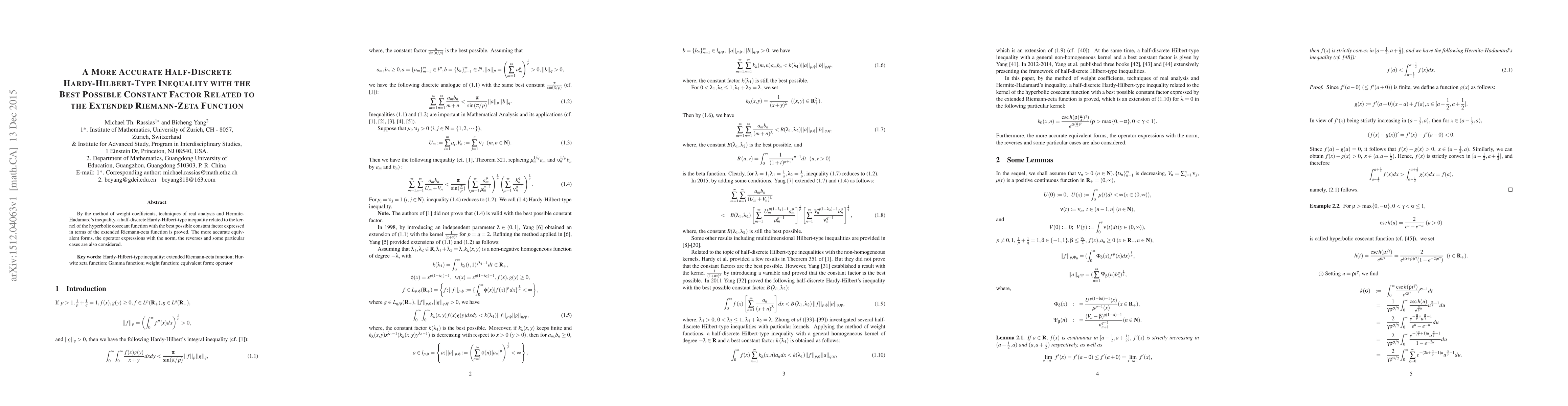 By the method of weight coefficients, techniques of real analysis and Hermite-Hadamard's inequality, a half-discrete Hardy-Hilbert-type inequality related to the kernel of the hyperbolic cosecant function with the best possible constant factor expressed in terms of the extended Riemann-zeta function is proved. The more accurate equivalent forms, the operator expressions with the norm, the reverses and some particular cases are also considered.