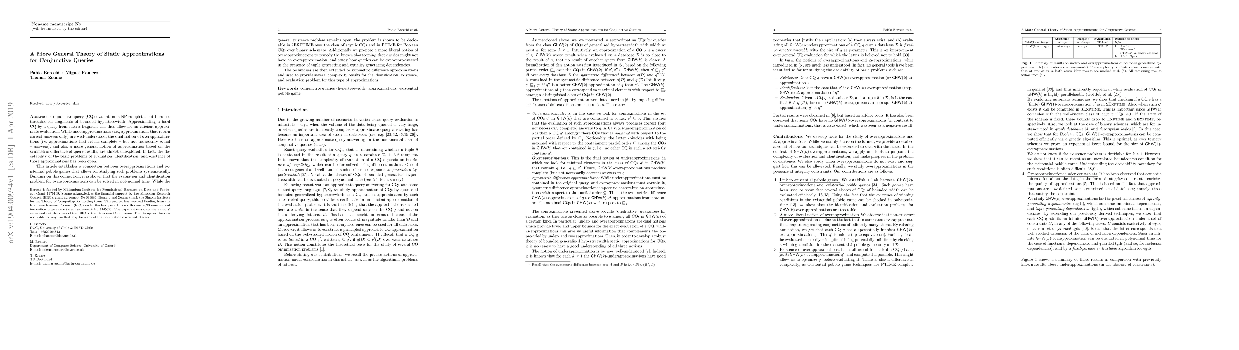 Conjunctive query (CQ) evaluation is NP-complete, but becomes tractable for fragments of bounded hypertreewidth. Approximating a hard CQ by a query from such a fragment can thus allow for an efficient approximate evaluation. While underapproximations (i.e., approximations that return correct answers only) are well-understood, the dual notion of overapproximations (i.e, approximations that return complete - but not necessarily sound - answers), and also a more general notion of approximation based on the symmetric difference of query results, are almost unexplored. In fact, the decidability of the basic problems of evaluation, identification, and existence of those approximations has been open. This article establishes a connection between overapproximations and existential pebble games that allows for studying such problems systematically. Building on this connection, it is shown that the evaluation and identification problem for overapproximations can be solved in polynomial time. While the general existence problem remains open, the problem is shown to be decidable in 2EXPTIME over the class of acyclic CQs and in PTIME for Boolean CQs over binary schemata. Additionally we propose a more liberal notion of overapproximations to remedy the known shortcoming that queries might not have an overapproximation, and study how queries can be overapproximated in the presence of tuple generating and equality generating dependencies. The techniques are then extended to symmetric difference approximations and used to provide several complexity results for the identification, existence, and evaluation problem for this type of approximations.