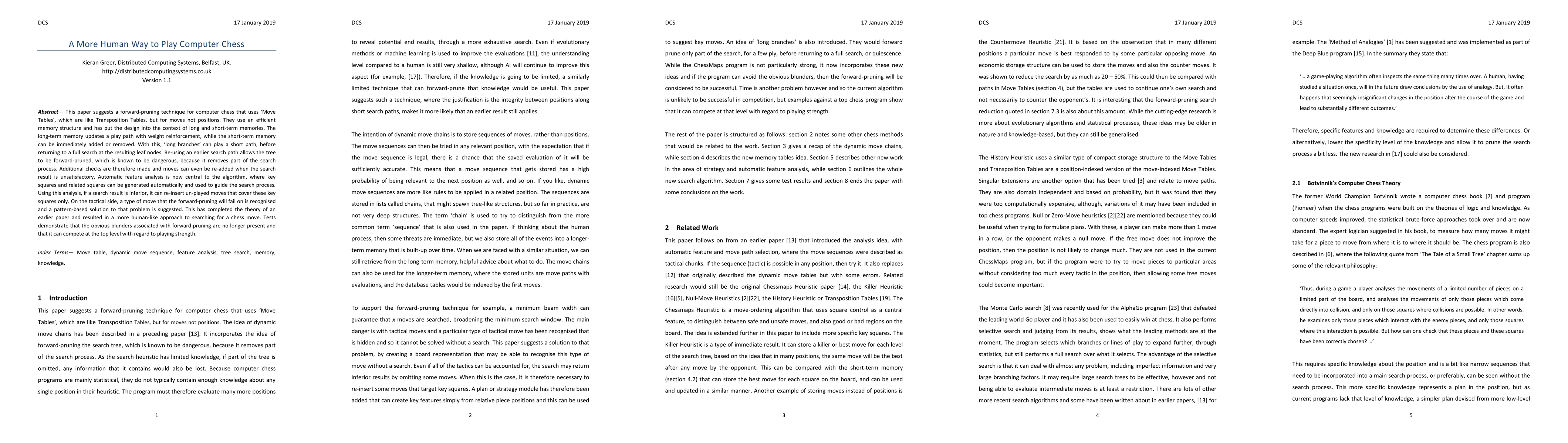 This paper proposes a forward-pruning technique for computer chess using 'Move Tables' to efficiently reuse earlier search paths, supplemented by long-term reinforcement and short-term memory updates. The method successfully mitigates the risks of forward pruning through automatic feature analysis and pattern-based solutions, resulting in a more human-like chess-playing approach.