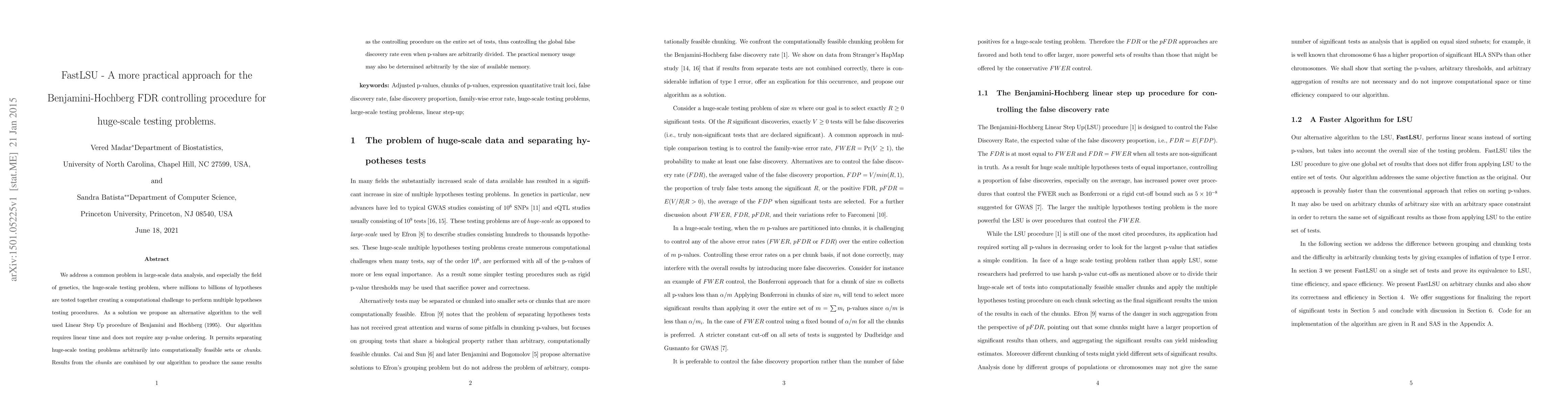 This paper proposes an alternative algorithm to the Linear Step Up procedure for controlling the false discovery rate (FDR) in large-scale testing problems, requiring linear time and no p-value ordering. It allows dividing the test set into manageable chunks, combining results to maintain FDR control and flexible memory usage.