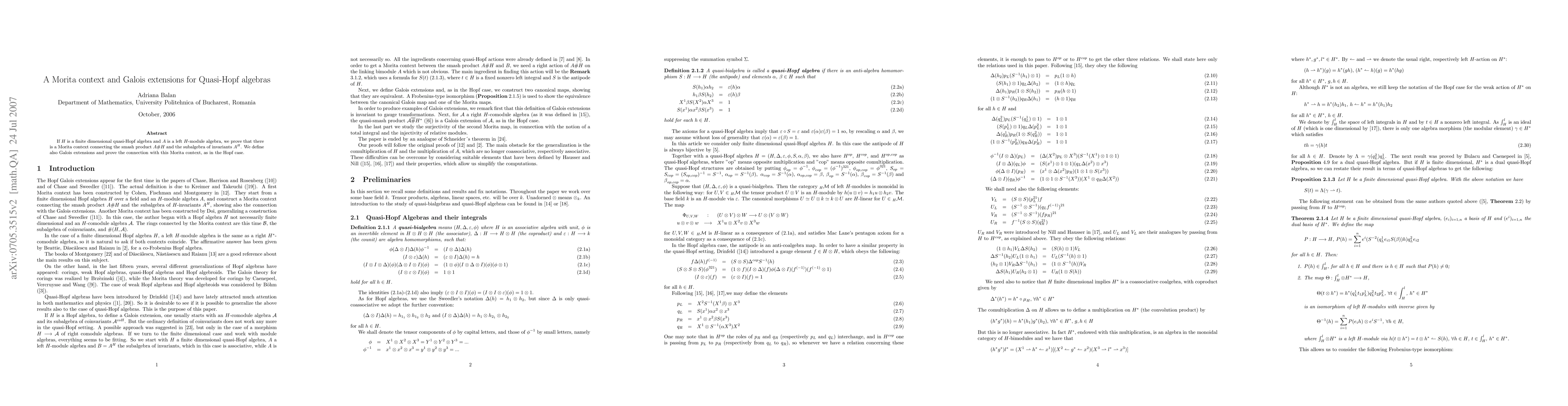 Summary: This paper establishes a Morita context linking the smash product of a quasi-Hopf algebra module algebra and its invariants, and explores the relationship between this context and Galois extensions, extending known results from the Hopf algebra setting.