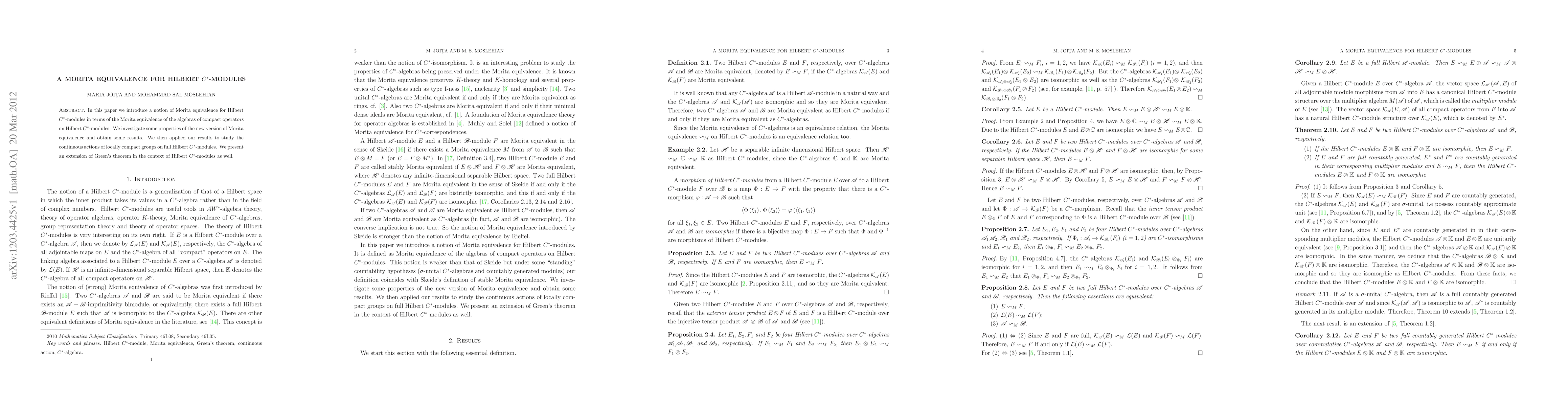 In this paper we introduce a notion of Morita equivalence for Hilbert C*-modules in terms of the Morita equivalence of the algebras of compact operators on Hilbert C*-modules. We investigate some properties of the new version of Morita equivalence and obtain some results. We then applied our results to study the continuous actions of locally compact groups on full Hilbert C*-modules. We present an extension of Green's theorem in the context of Hilbert C*-modules as well.
