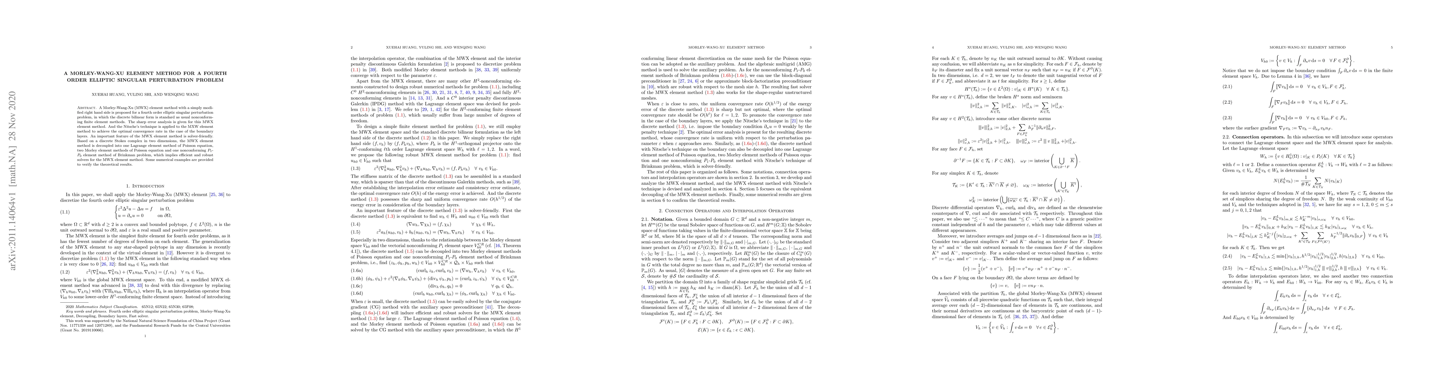 A Morley-Wang-Xu (MWX) element method with a simply modified right hand side is proposed for a fourth order elliptic singular perturbation problem, in which the discrete bilinear form is standard as usual nonconforming finite element methods. The sharp error analysis is given for this MWX element method. And the Nitsche's technique is applied to the MXW element method to achieve the optimal convergence rate in the case of the boundary layers. An important feature of the MWX element method is solver-friendly. Based on a discrete Stokes complex in two dimensions, the MWX element method is decoupled into one Lagrange element method of Poisson equation, two Morley element methods of Poisson equation and one nonconforming $P_1$-$P_0$ element method of Brinkman problem, which implies efficient and robust solvers for the MWX element method. Some numerical examples are provided to verify the theoretical results.