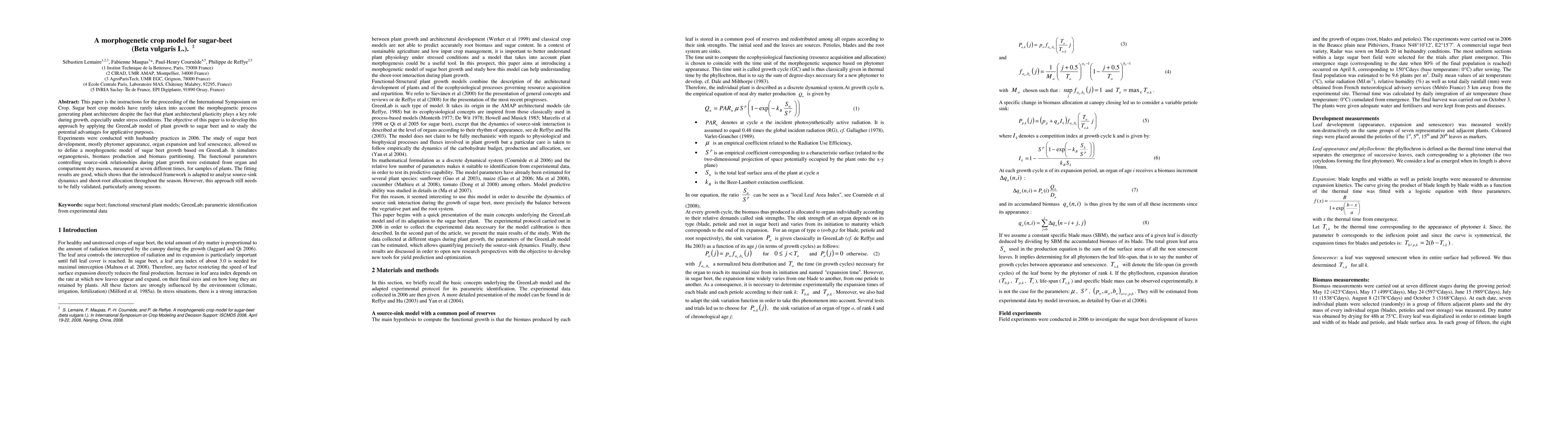 This paper is the instructions for the proceeding of the International Symposium on Crop. Sugar beet crop models have rarely taken into account the morphogenetic process generating plant architecture despite the fact that plant architectural plasticity plays a key role during growth, especially under stress conditions. The objective of this paper is to develop this approach by applying the GreenLab model of plant growth to sugar beet and to study the potential advantages for applicative purposes. Experiments were conducted with husbandry practices in 2006. The study of sugar beet development, mostly phytomer appearance, organ expansion and leaf senescence, allowed us to define a morphogenetic model of sugar beet growth based on GreenLab. It simulates organogenesis, biomass production and biomass partitioning. The functional parameters controlling source-sink relationships during plant growth were estimated from organ and compartment dry masses, measured at seven different times, for samples of plants. The fitting results are good, which shows that the introduced framework is adapted to analyse source-sink dynamics and shoot-root allocation throughout the season. However, this approach still needs to be fully validated, particularly among seasons.