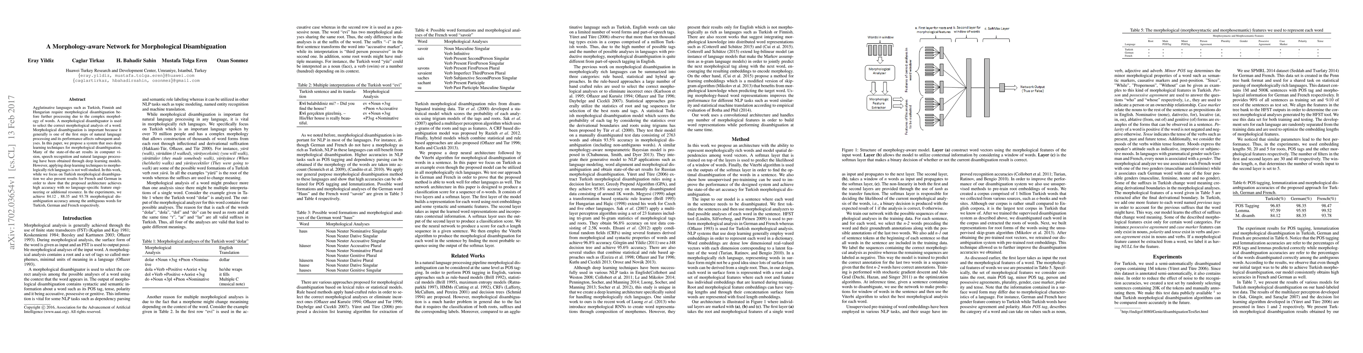 This paper proposes a deep learning-based morphological disambiguator for agglutinative languages like Turkish, emphasizing its effectiveness across multiple languages without language-specific feature engineering. The model achieves high accuracy rates of 84.12% for Turkish, 88.35% for German, and 93.78% for French.
