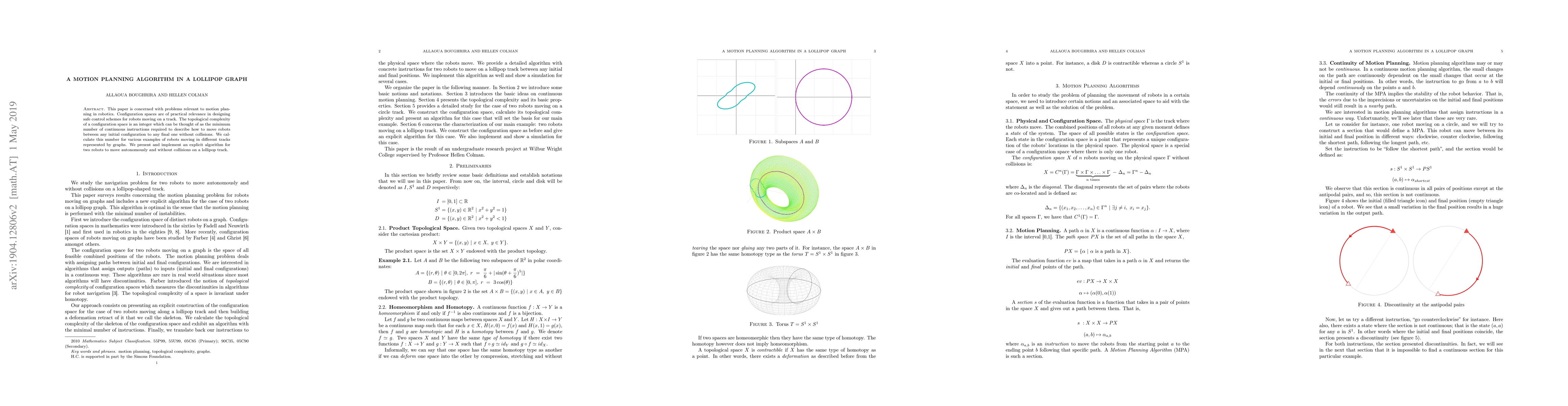 This paper develops a motion planning algorithm for two robots navigating a lollipop track without collisions, calculating the topological complexity of configuration spaces to determine the minimum number of instructions needed. The algorithm is explicitly implemented for this specific track configuration.