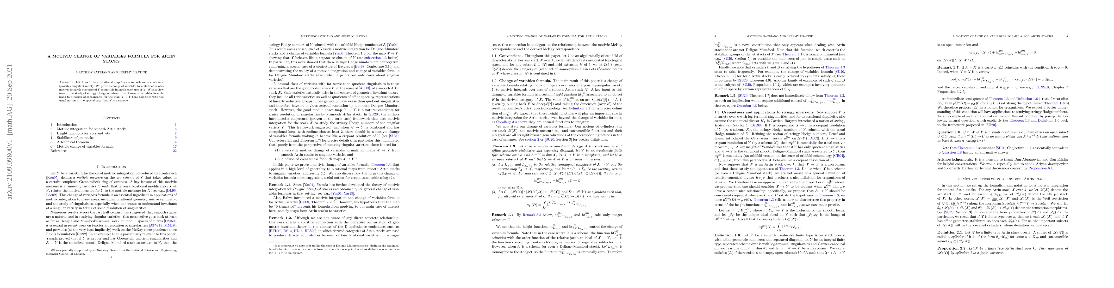 Let $\mathcal{X} \to Y$ be a birational map from a smooth Artin stack to a (possibly singular) variety. We prove a change of variables formula that relates motivic integrals over arcs of $Y$ to motivic integrals over arcs of $\mathcal{X}$. With a view toward the study of stringy Hodge numbers, this change of variables formula leads to a new notion of crepantness for the map $\mathcal{X} \to Y$ that coincides with the usual notion in the special case that $\mathcal{X}$ is a scheme.