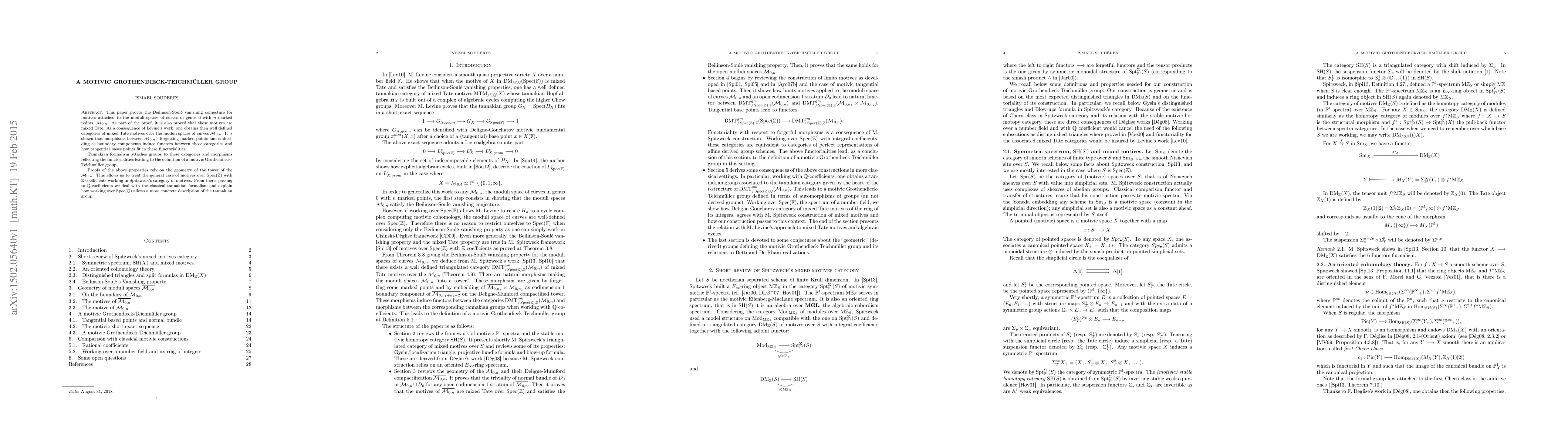 This paper proves the Beilinson-Soul{\'e} vanishing conjecture for motives attached to the moduli spaces of curves of genus 0 with n marked points. As part of the proof, it is also proved that these motives are mixed Tate. As a consequence of Levine's work, one obtains then well defined categories of mixed Tate motives over the moduli spaces of curves . It is shown that morphisms between moduli spaces forgetting marked points and embedding as boundary components induce functors between those categories and how tangential bases points fit in these functorialities. Tannakian formalism attaches groups to these categories and morphisms reflecting the functorialities leading to the definition of a motivic Grothendieck-Teichm{\"u}ller group. Proofs of the above properties rely on the geometry of the tower of the moduli spaces . This allows us to treat the general case of motives over Spec(Z) with integral coefficients working in Spitzweck's category of motives. From there, passing to Q-coefficients we deal with the classical tannakian formalism and explain how working over Spec(Q) allows a more concrete description of the tannakian group.