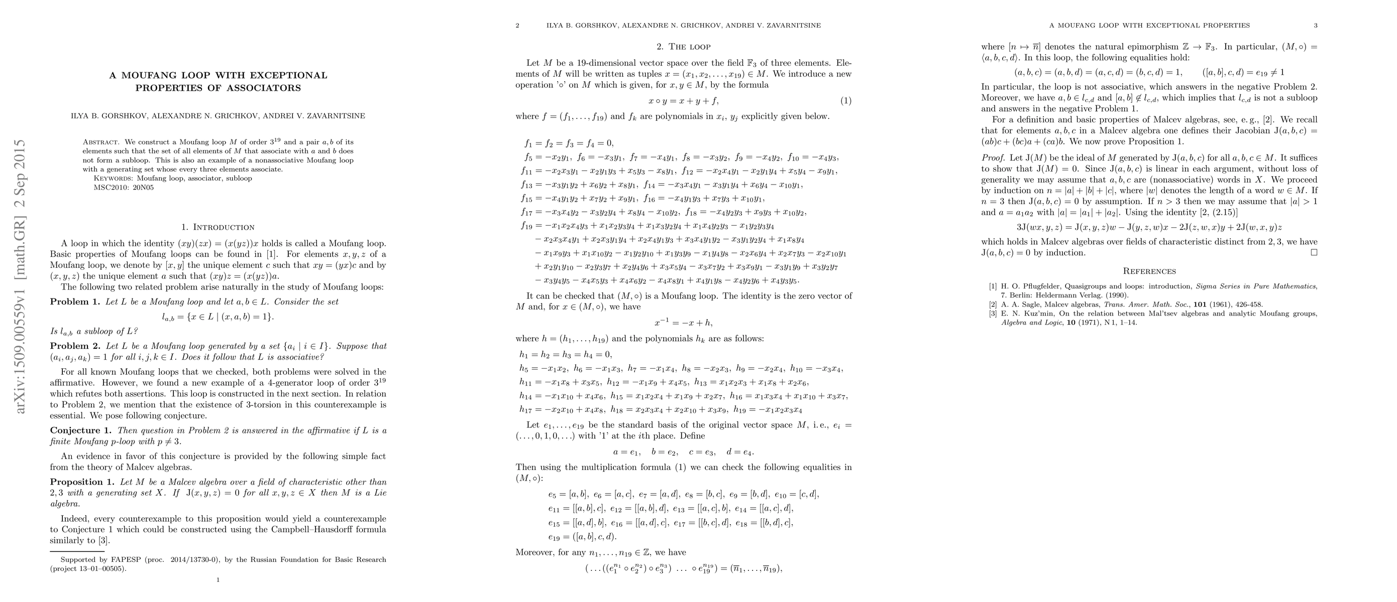 Summary: This paper constructs a Moufang loop $M$ of order $3^{19}$ where a pair $a,b$ exhibits exceptional associator properties, demonstrating that not all elements associating with $a$ and $b$ form a subloop, highlighting a unique nonassociative structure.
