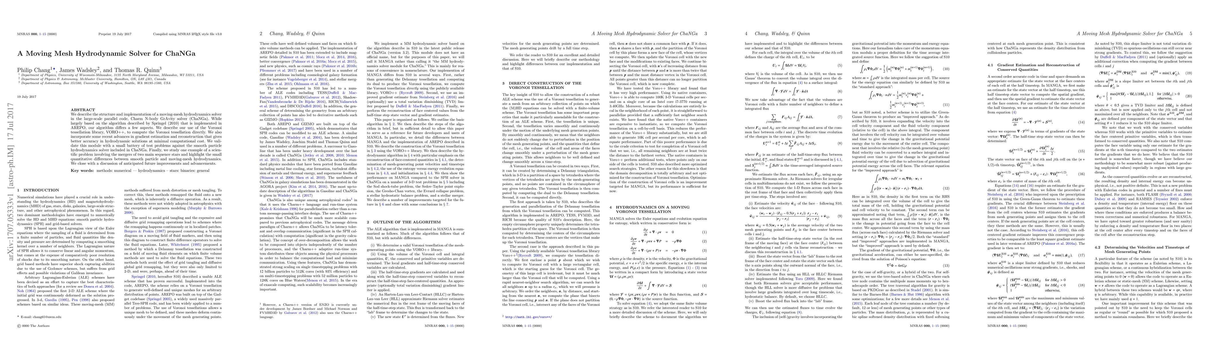 This paper presents a moving-mesh hydrodynamic solver for ChaNGa, utilizing VORO++ for Voronoi tessellation and incorporating recent gradient estimation advances. It validates the solver against smooth particle hydrodynamics and examines star mergers, noting minor differences between the two methods.
