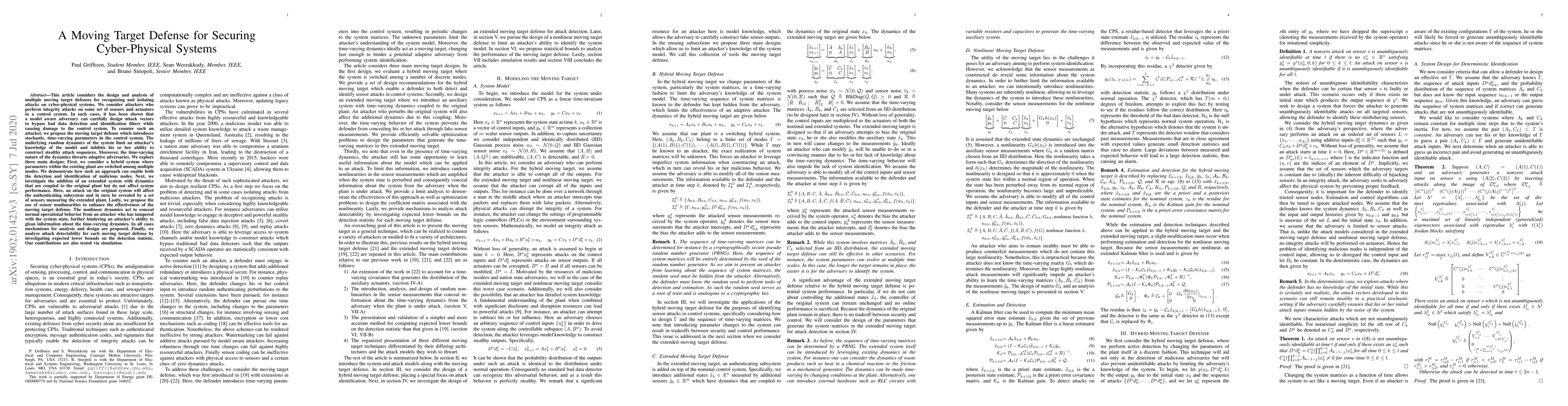 This article considers the design and analysis of multiple moving target defenses for recognizing and isolating attacks on cyber-physical systems. We consider attackers who perform integrity attacks on a set of sensors and actuators in a control system. In such cases, a model aware adversary can carefully design attack vectors to bypass bad data detection and identification filters while causing damage to the control system. To counter such an attacker, we propose the moving target defense which introduces stochastic, time-varying parameters in the control system. The underlying random dynamics of the system limit an attacker's model knowledge and inhibits his/her ability to construct stealthy attack sequences. Moreover, the time-varying nature of the dynamics thwarts adaptive adversaries. We explore three main designs. First, we consider a hybrid system where parameters within the existing plant are switched among multiple modes. We demonstrate how such an approach can enable both the detection and identification of malicious nodes. Next, we investigate the addition of an extended system with dynamics that are coupled to the original plant but do not affect system performance. An attack on the original system will affect the authenticating subsystem and in turn be revealed by a set of sensors measuring the extended plant. Lastly, we propose the use of sensor nonlinearities to enhance the effectiveness of the moving target defense. The nonlinear dynamics act to conceal normal operational behavior from an attacker who has tampered with the system state, further hindering an attacker's ability to glean information about the time-varying dynamics. In all cases mechanisms for analysis and design are proposed. Finally, we analyze attack detectability for each moving target defense by investigating expected lower bounds on the detection statistic. Our contributions are tested via simulation.