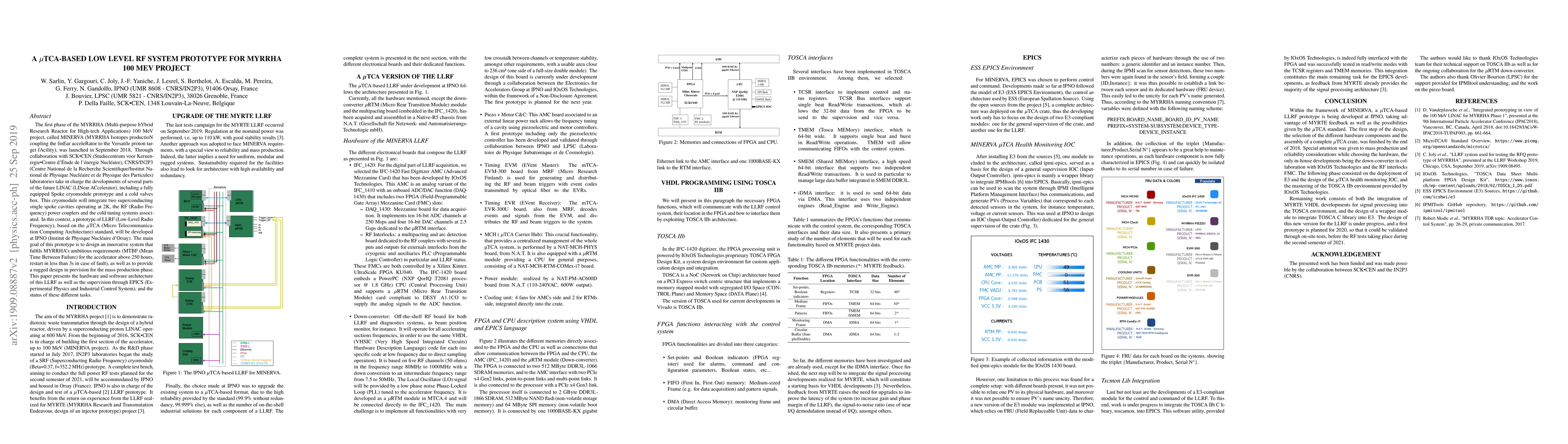 The first phase of the MYRRHA (Multi-purpose hYbrid Research Reactor for High-tech Applications) project, MINERVA, was launched in September 2018. Through collaboration with the SCK-CEN, IN2P3 laboratories take in charge the developments of several parts of the accelerator, including a fully equipped Spoke cryomodule prototype and a cold valves box. This cryomodule will integrate two superconducting single spoke cavities operating at 2K, the RF power couplers and the cold tuning systems associated. For control and regulation purpose, a mTCA LLRF system prototype is being implemented and will be presented here alongside with the hardware, VHDL and EPICS developments that aim to fulfil MYRRHA's ambitious requirements.