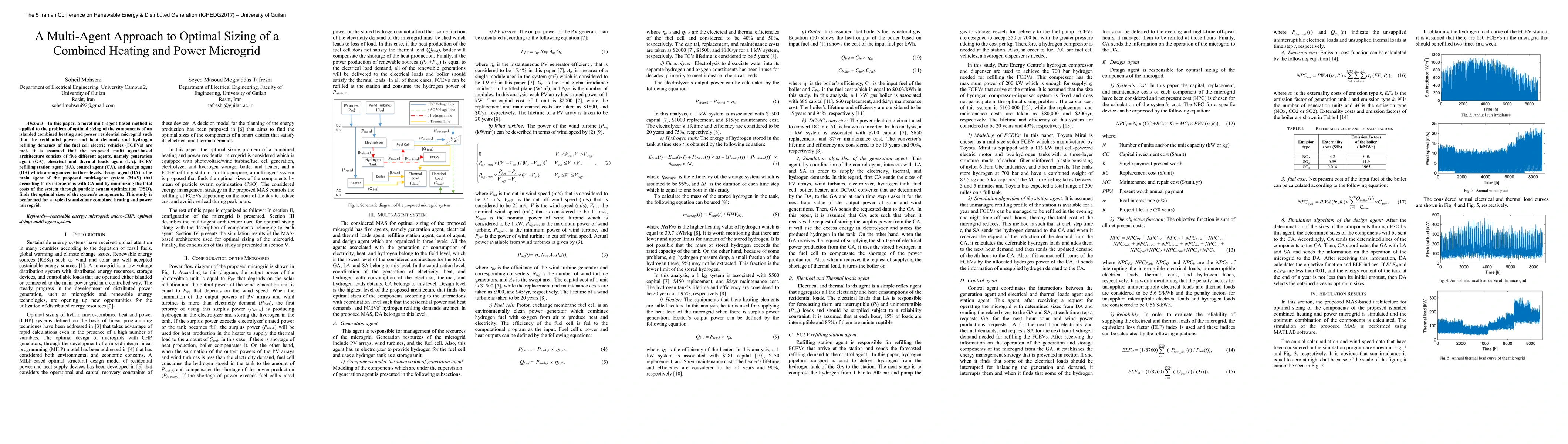 This paper proposes a multi-agent system for optimal sizing of a combined heating and power microgrid, utilizing five agents to meet residential power and heat demands and hydrogen refilling for fuel cell electric vehicles. The design agent optimizes component sizes using particle swarm optimization to minimize total costs.