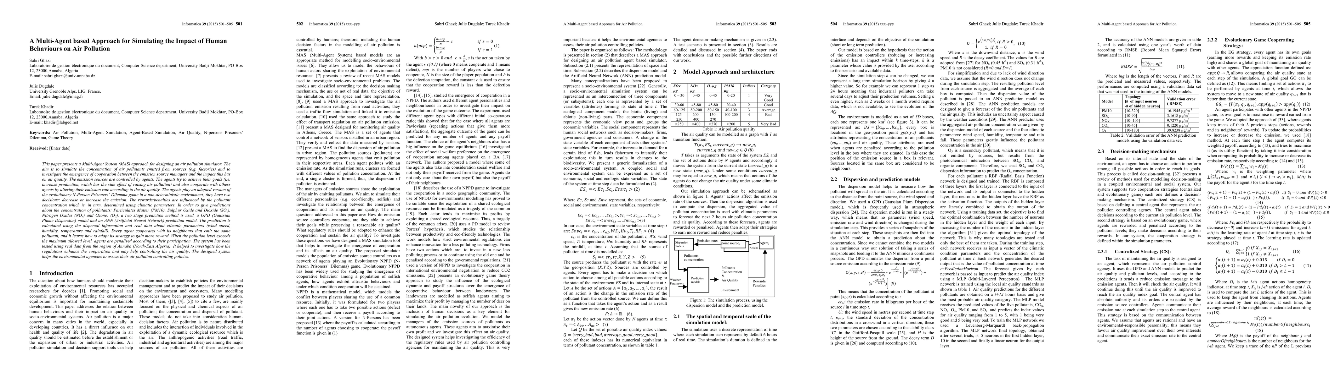 The paper presents a Multi-Agent System (MAS) approach for designing an air pollution simulator. It uses an evolutionary N-Person Prisoners' Dilemma game in a non-deterministic environment, with agents controlling emission sources. The system incorporates an Artificial Neural Network (ANN) prediction model using climatic parameters and dispersal information.