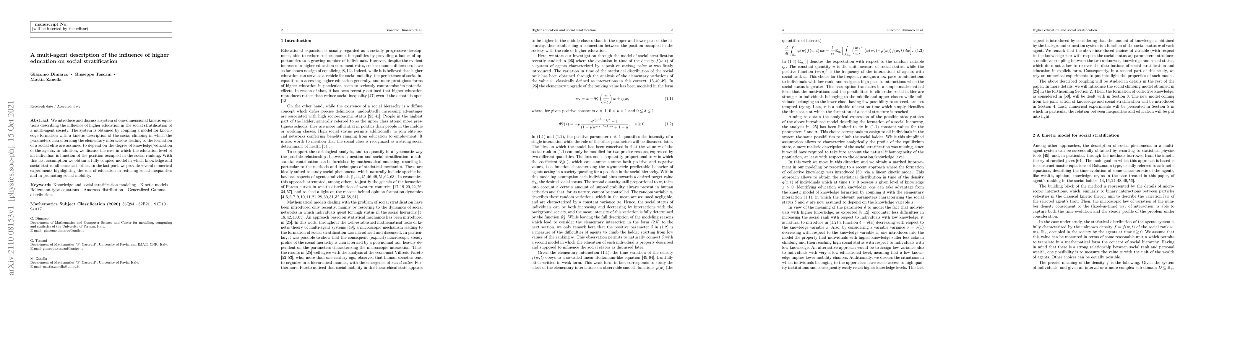 We introduce and discuss a system of one-dimensional kinetic equations describing the influence of higher education in the social stratification of a multi-agent society. The system is obtained by coupling a model for knowledge formation with a kinetic description of the social climbing in which the parameters characterizing the elementary interactions leading to the formation of a social elite are assumed to depend on the degree of knowledge/education of the agents. In addition, we discuss the case in which the education level of an individual is function of the position occupied in the social ranking. With this last assumption we obtain a fully coupled model in which knowledge and social status influence each other. In the last part, we provide several numerical experiments highlighting the role of education in reducing social inequalities and in promoting social mobility.