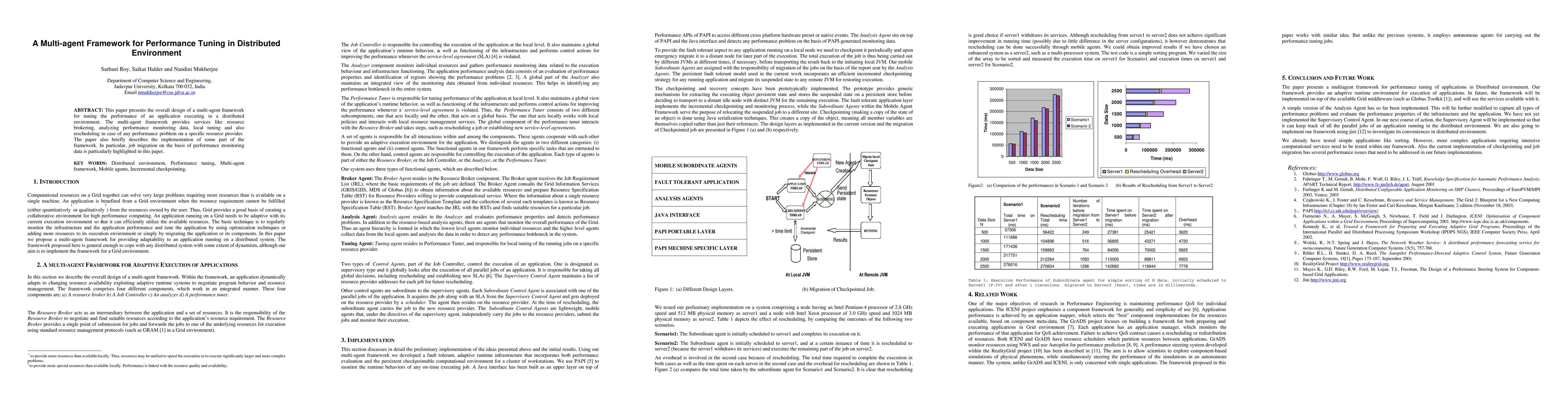 This paper presents the overall design of a multi-agent framework for tuning the performance of an application executing in a distributed environment. The multi-agent framework provides services like resource brokering, analyzing performance monitoring data, local tuning and also rescheduling in case of any performance problem on a specific resource provider. The paper also briefly describes the implementation of some part of the framework. In particular, job migration on the basis of performance monitoring data is particularly highlighted in this paper.